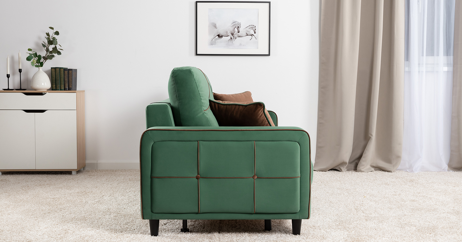 Декоративные канты на подушках и вставке подлокотников. Пуговицы в местах пересечения кантов на подушке и вставке подлокотников. По торцам подлокотников и думках контрастный декоративный кант. Защипы на сиденье и средней большой подушке.