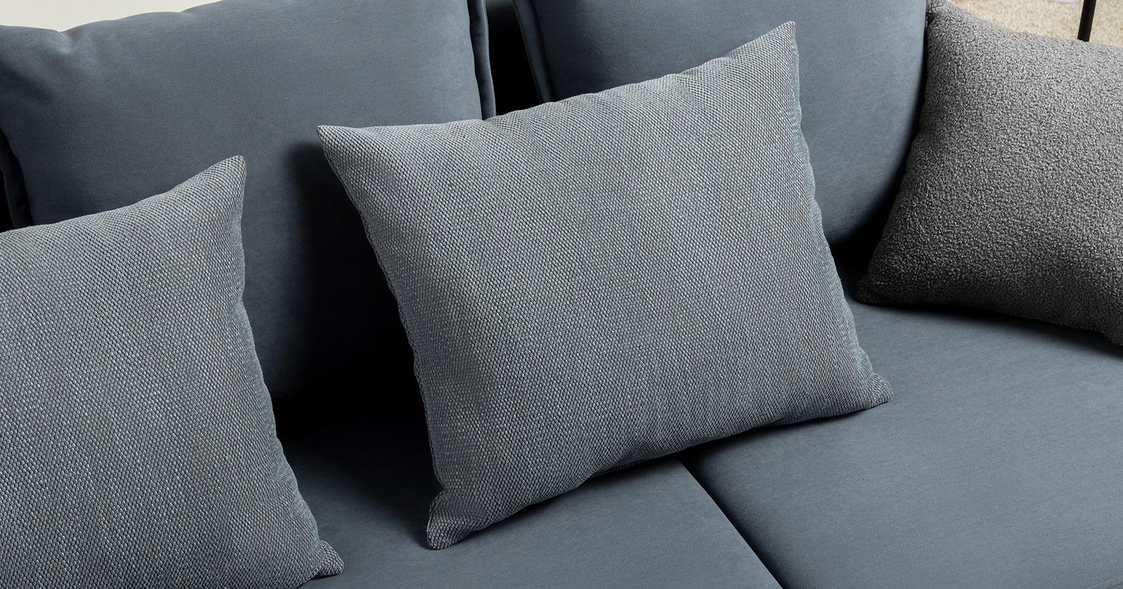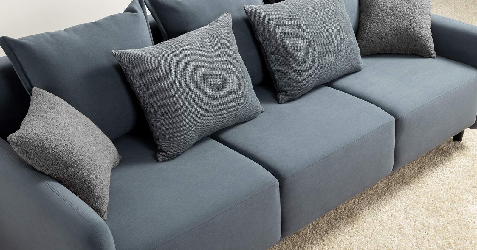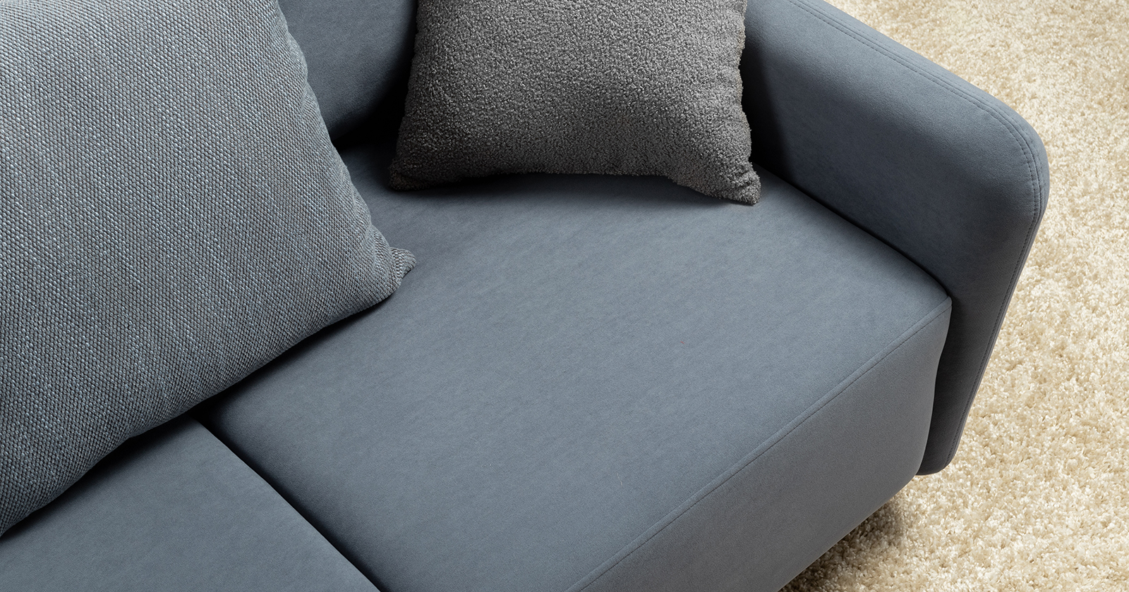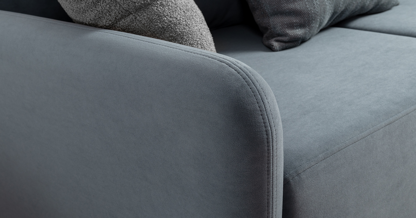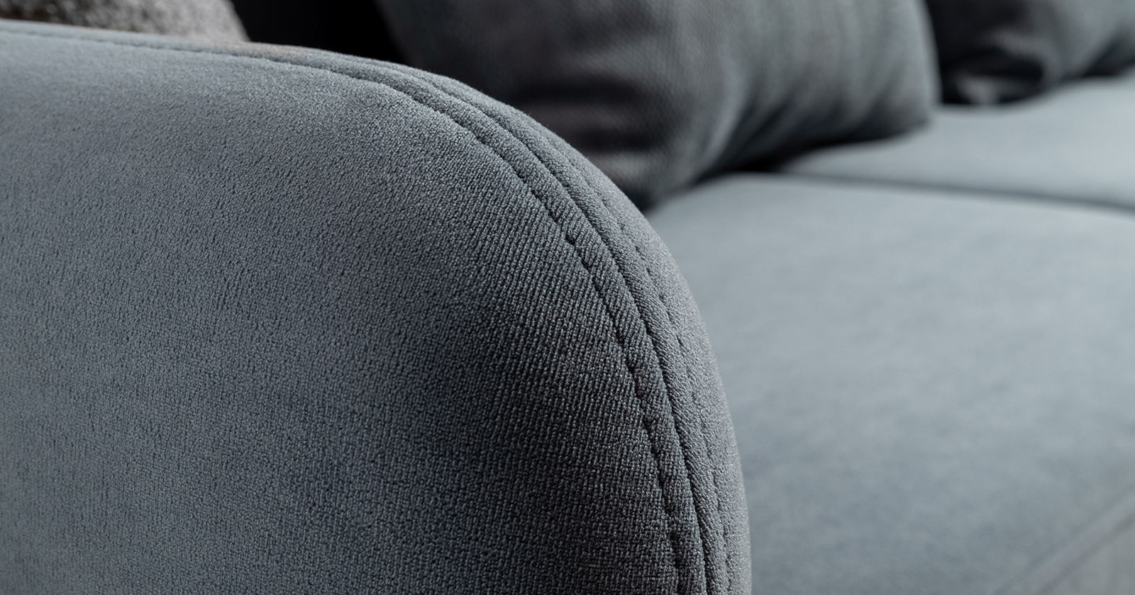 В комплекте 5 двусторонних приспинных подушки и 2 декоративные думки. Задняя спинка в ткани основы. Декоративные отделочные строчки по боковинам и сиденью