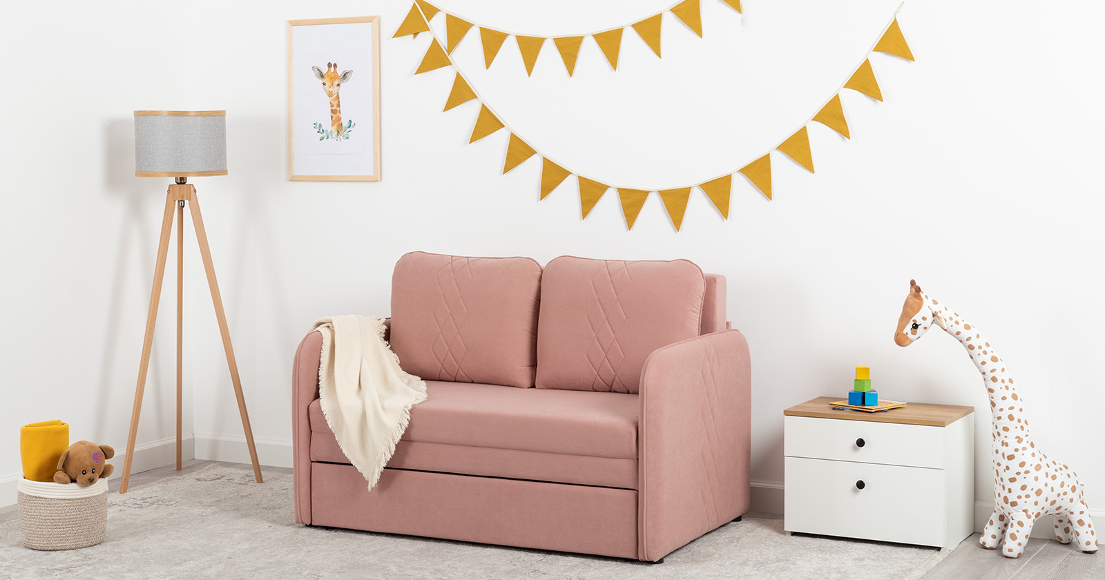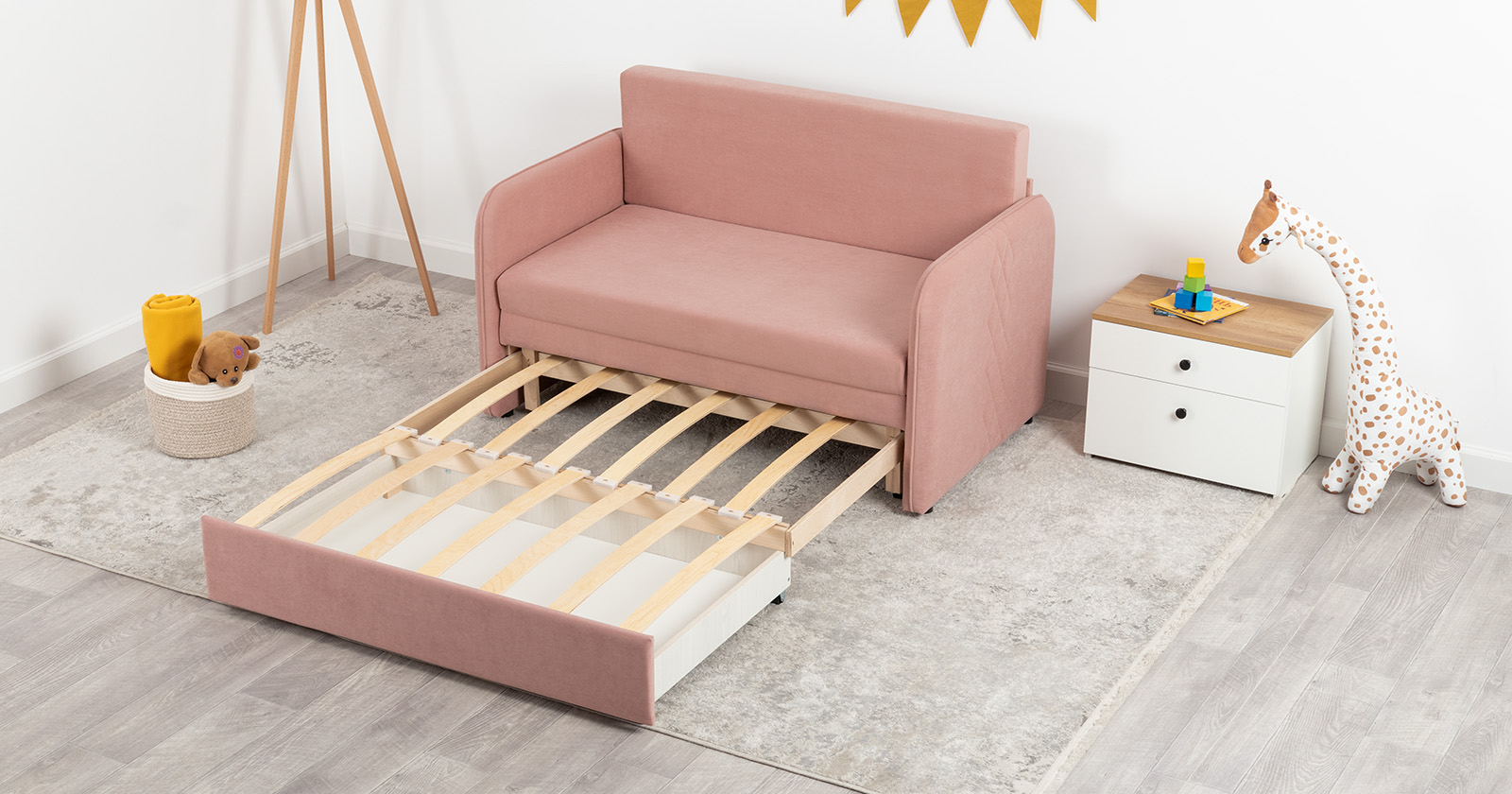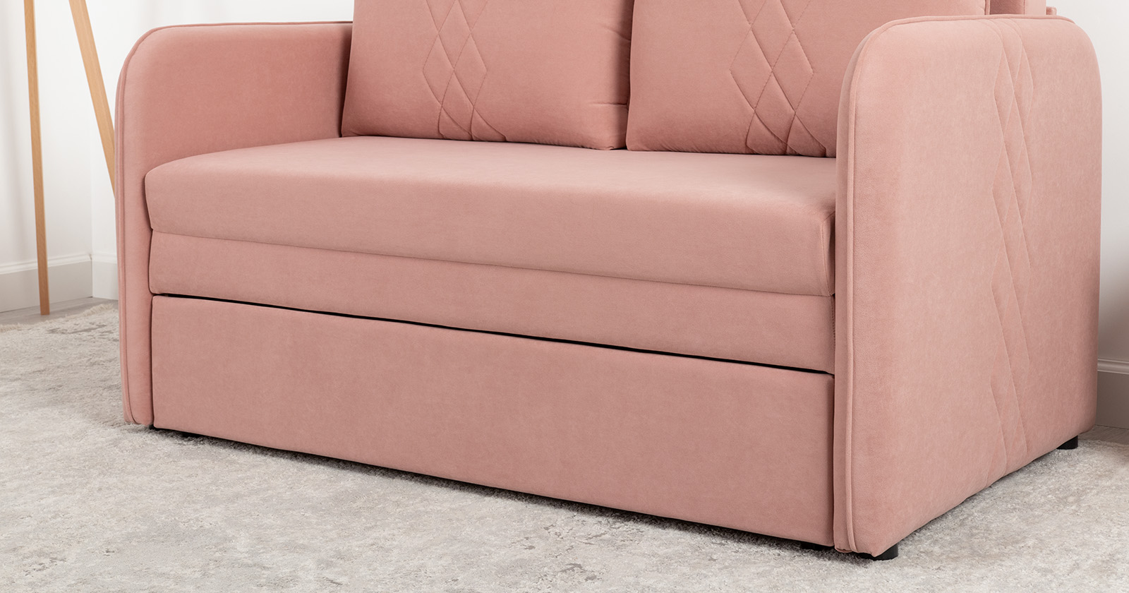 Стильный компактный диван для детской и гостиной. При своих скромных размерах он трансформируется в полноценное спальное место для детей и подростков. Лаконичный дизайн в виде декоративной стежки подчеркивает фактуру велюра, а небольшие размеры позволят разместить его в любом пространстве.