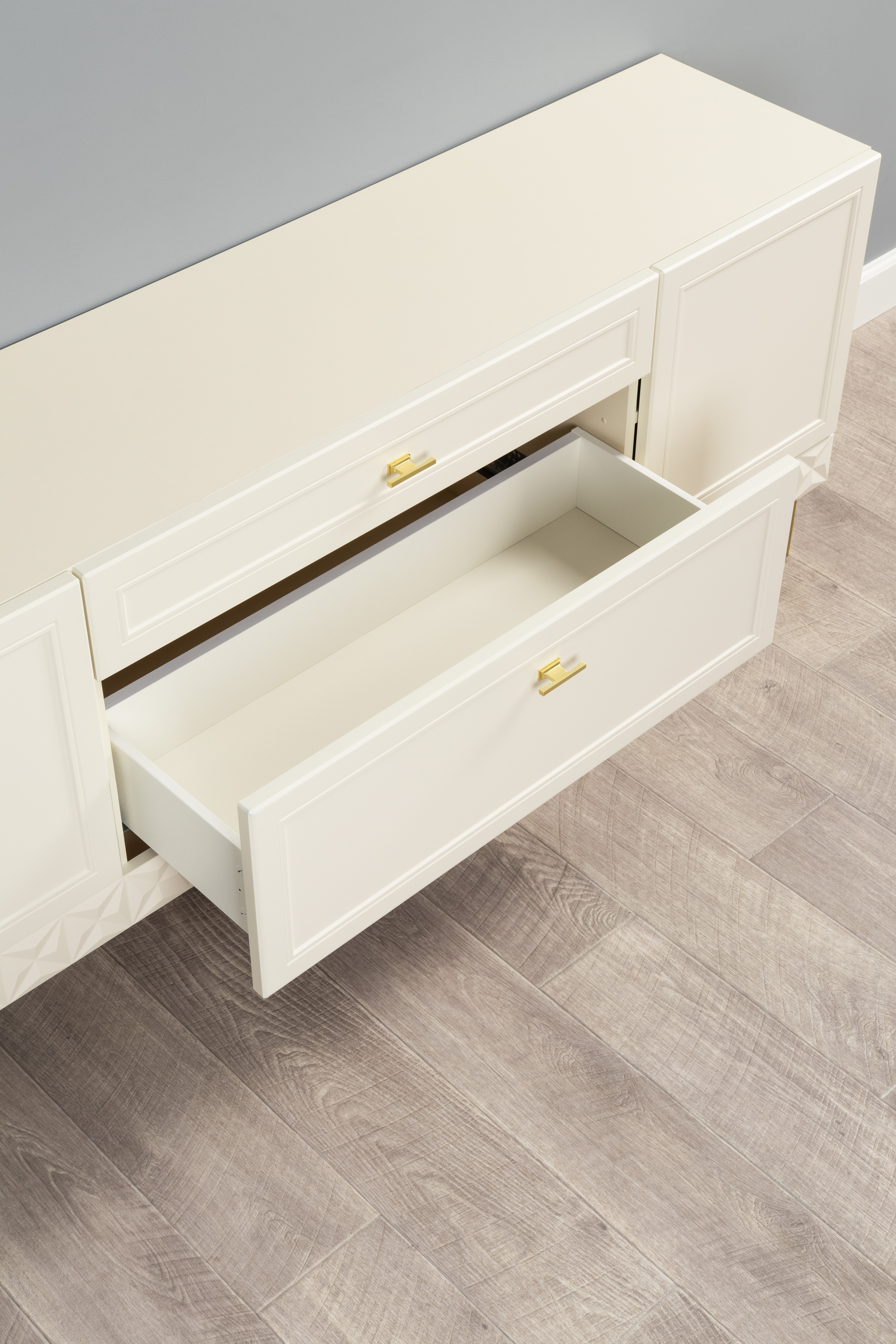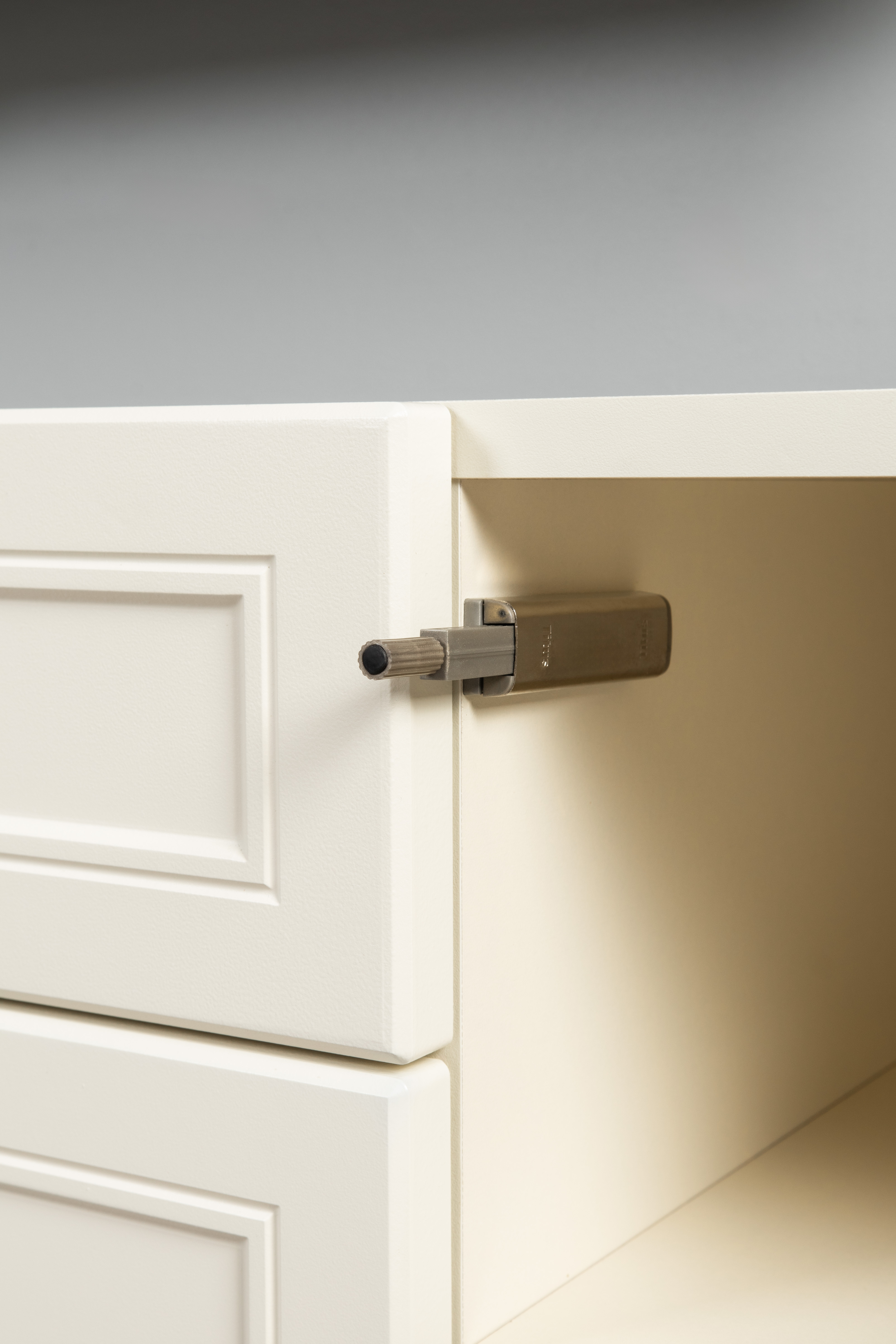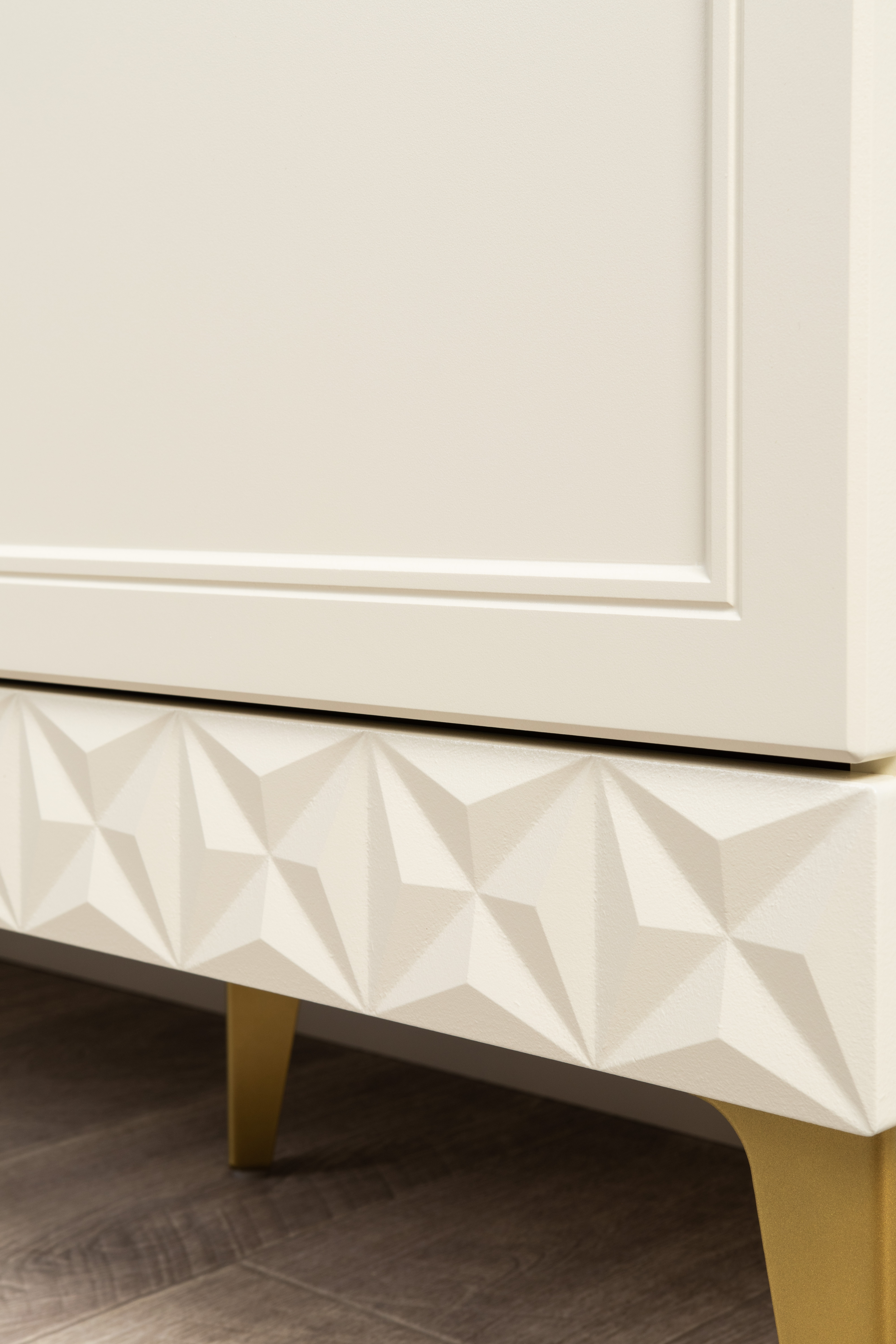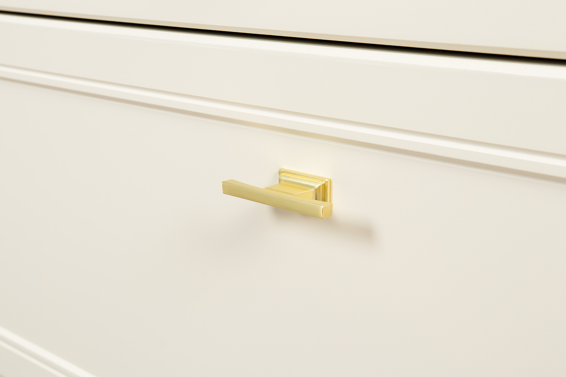 Изящные линии, глубокая фрезеровка фасадов из МДФ и благородные оттенки. Утончённая «Слоновая кость» и изысканная «Олива Шагрень» с глубоким зелёным тоном — создают атмосферу уюта, тепла и благородства. Металлические ручки и опоры золотого цвета придают мебели утончённый блеск, а петли и направляющие с доводчиками обеспечивают плавное и бесшумное закрытие фасадов.