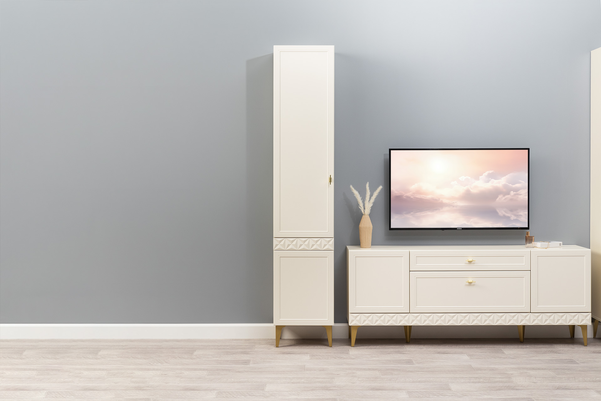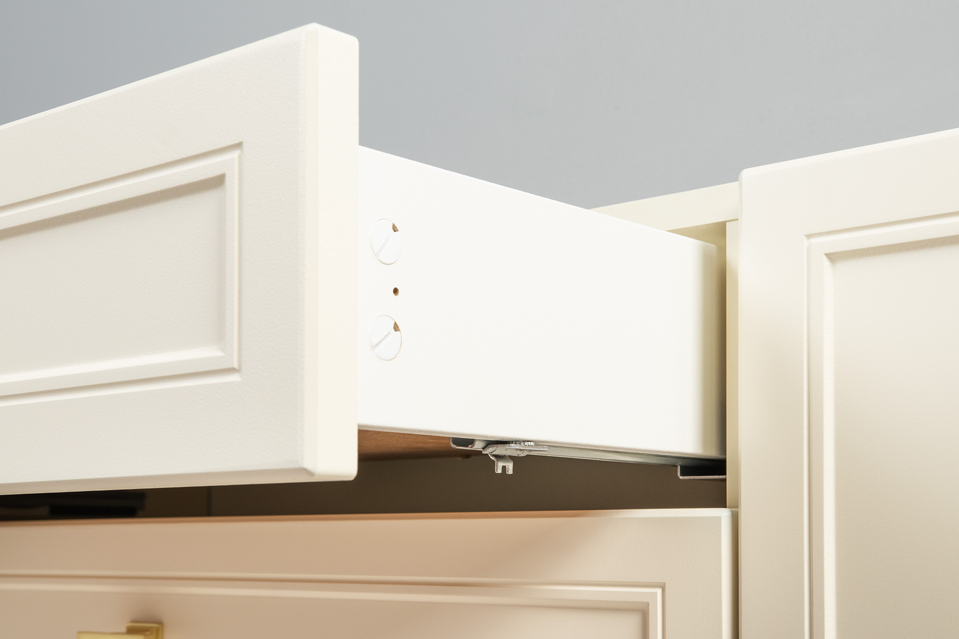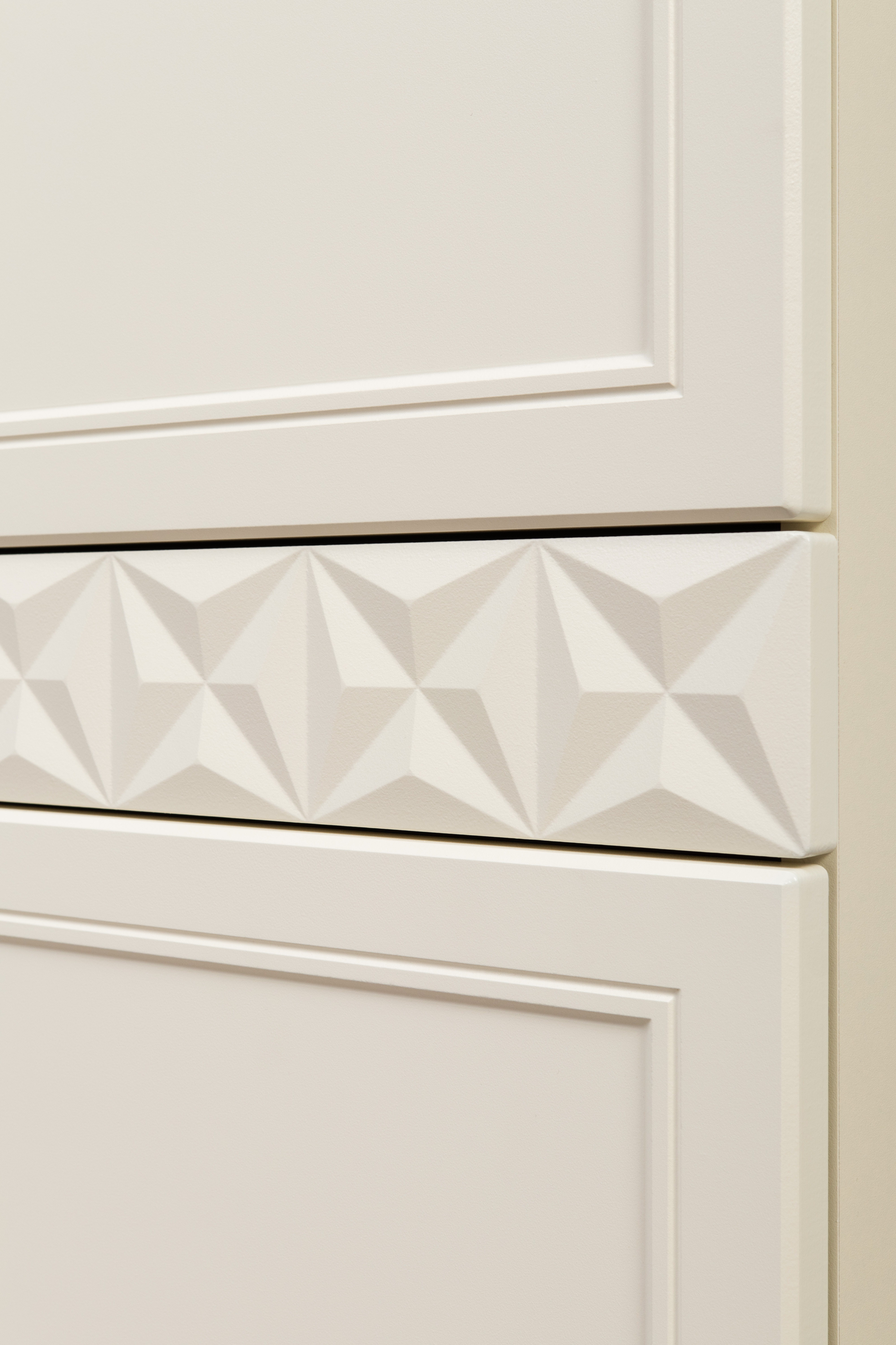 Изящные линии, глубокая фрезеровка фасадов из МДФ и благородные оттенки. Утончённая «Слоновая кость» и изысканная «Олива Шагрень» с глубоким зелёным тоном — создают атмосферу уюта, тепла и благородства. Металлические ручки и опоры золотого цвета придают мебели утончённый блеск, а петли и направляющие с доводчиками обеспечивают плавное и бесшумное закрытие фасадов.