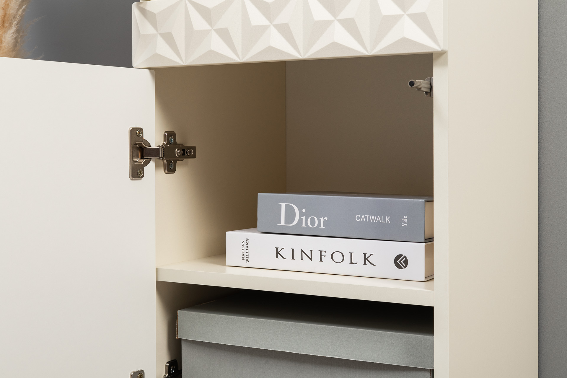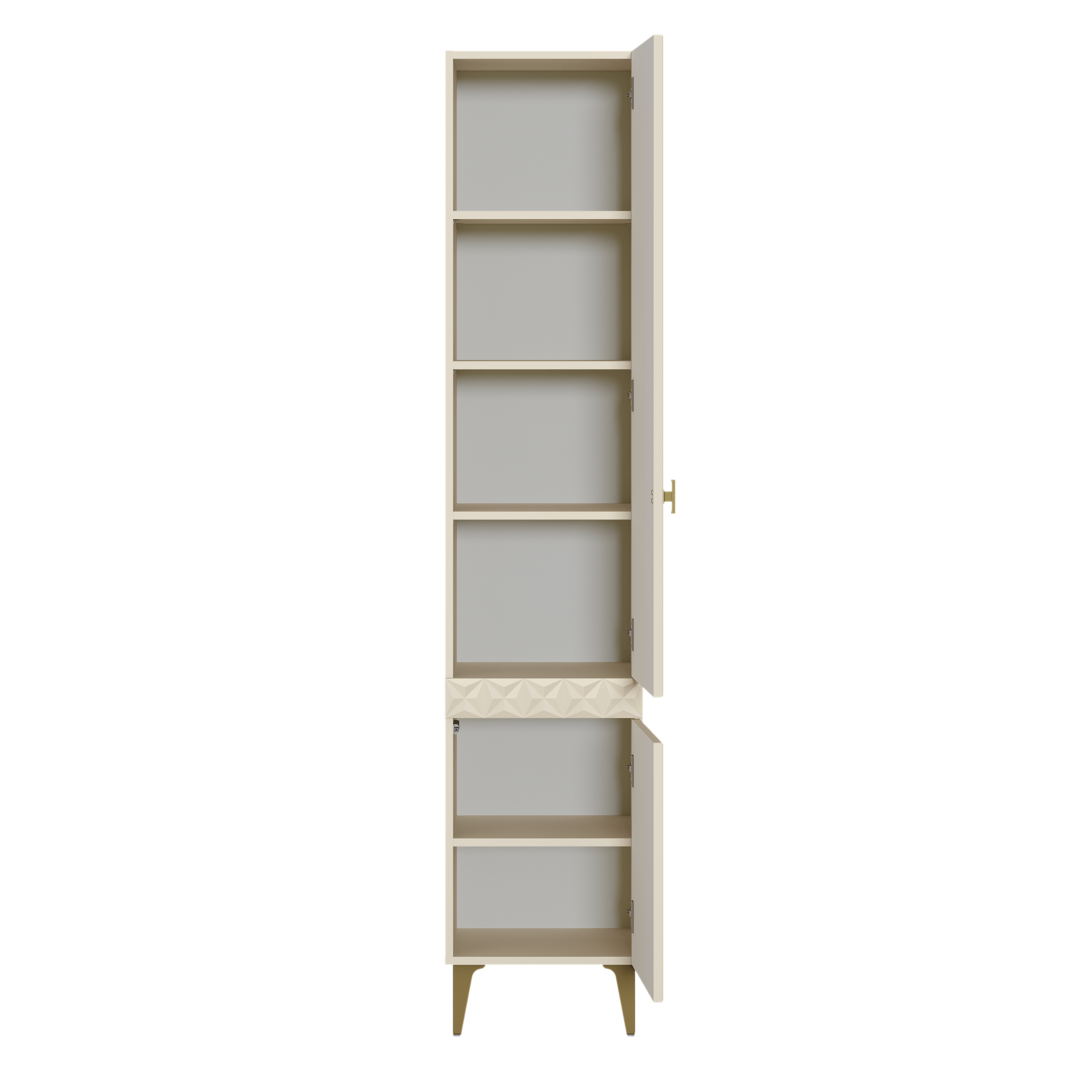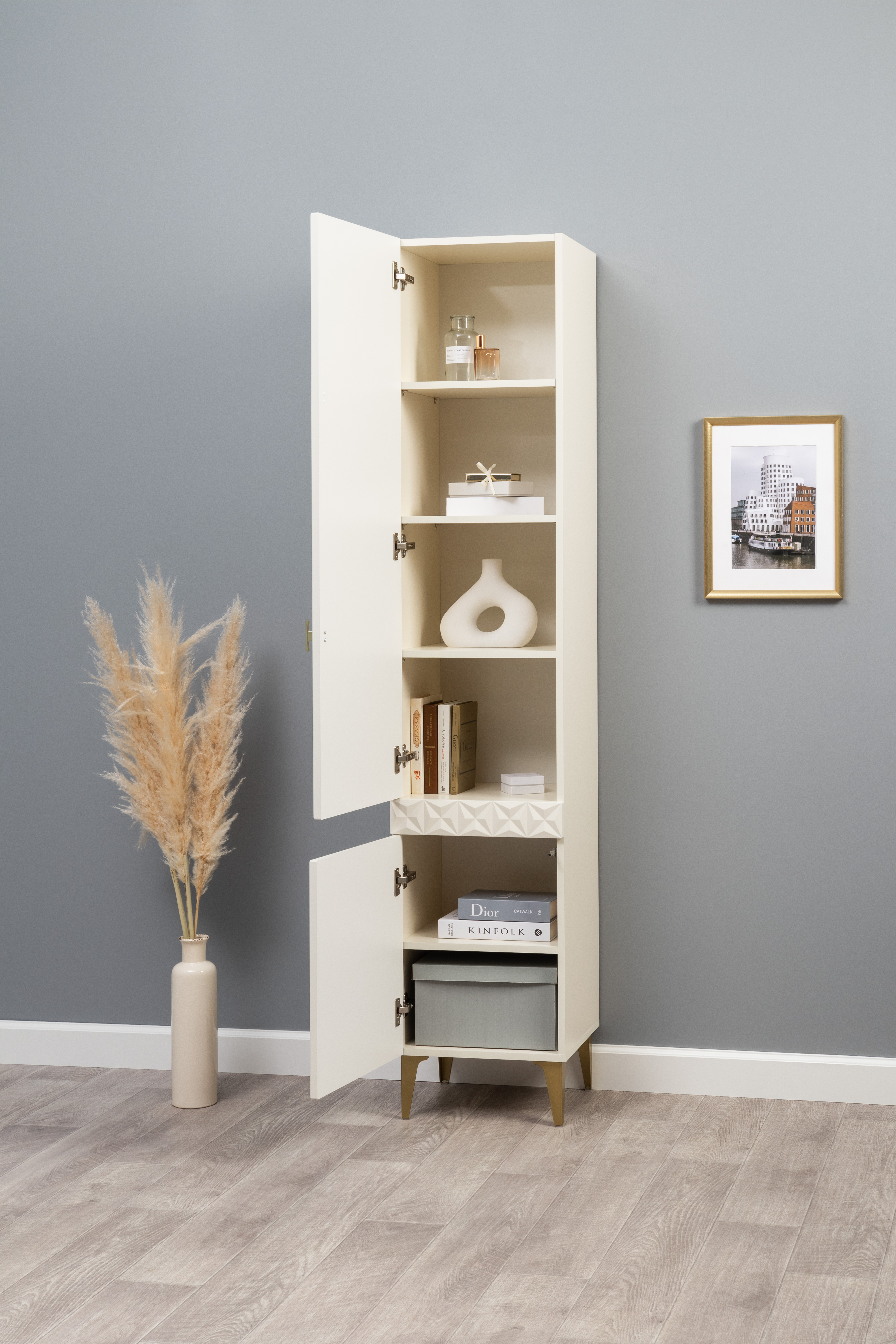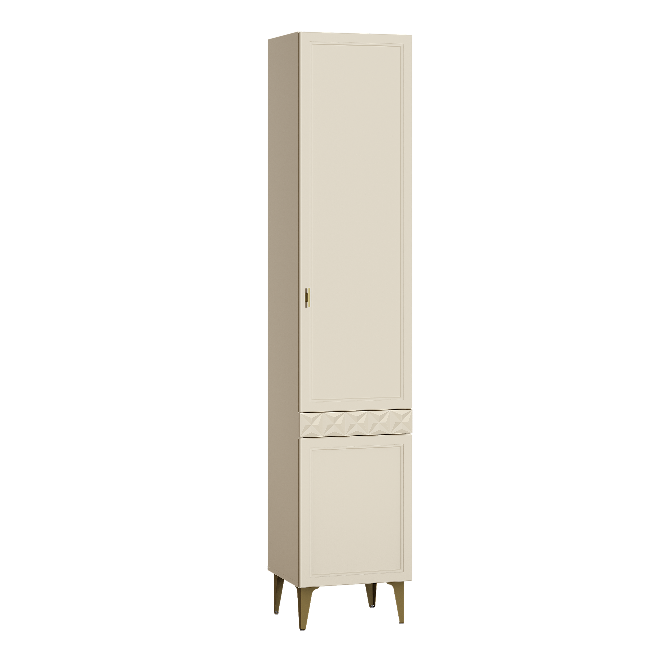Изящные линии, глубокая фрезеровка фасадов из МДФ и благородные оттенки. Утончённая «Слоновая кость» и изысканная «Олива Шагрень» с глубоким зелёным тоном — создают атмосферу уюта, тепла и благородства. Металлические ручки и опоры золотого цвета придают мебели утончённый блеск, а петли и направляющие с доводчиками обеспечивают плавное и бесшумное закрытие фасадов.