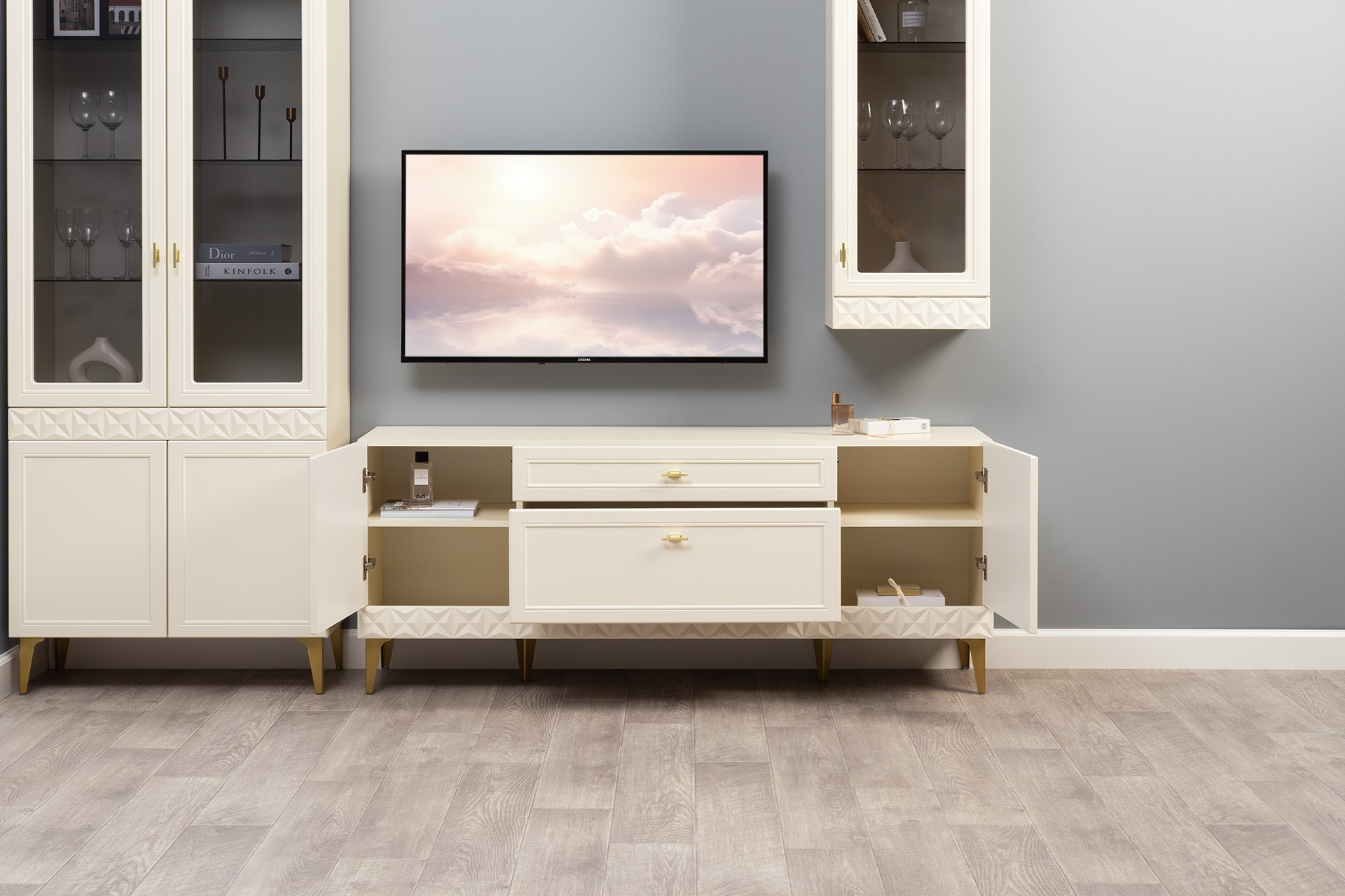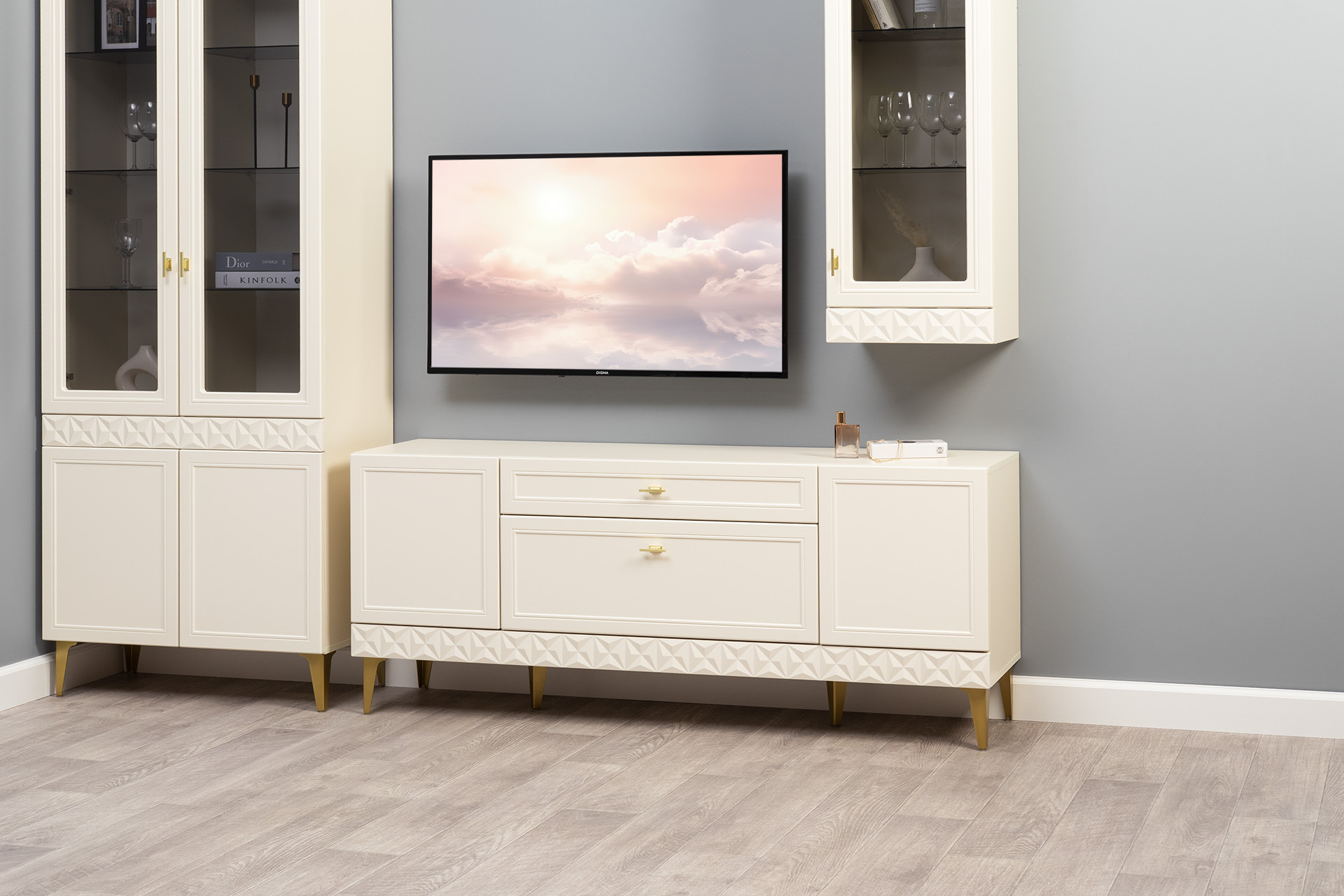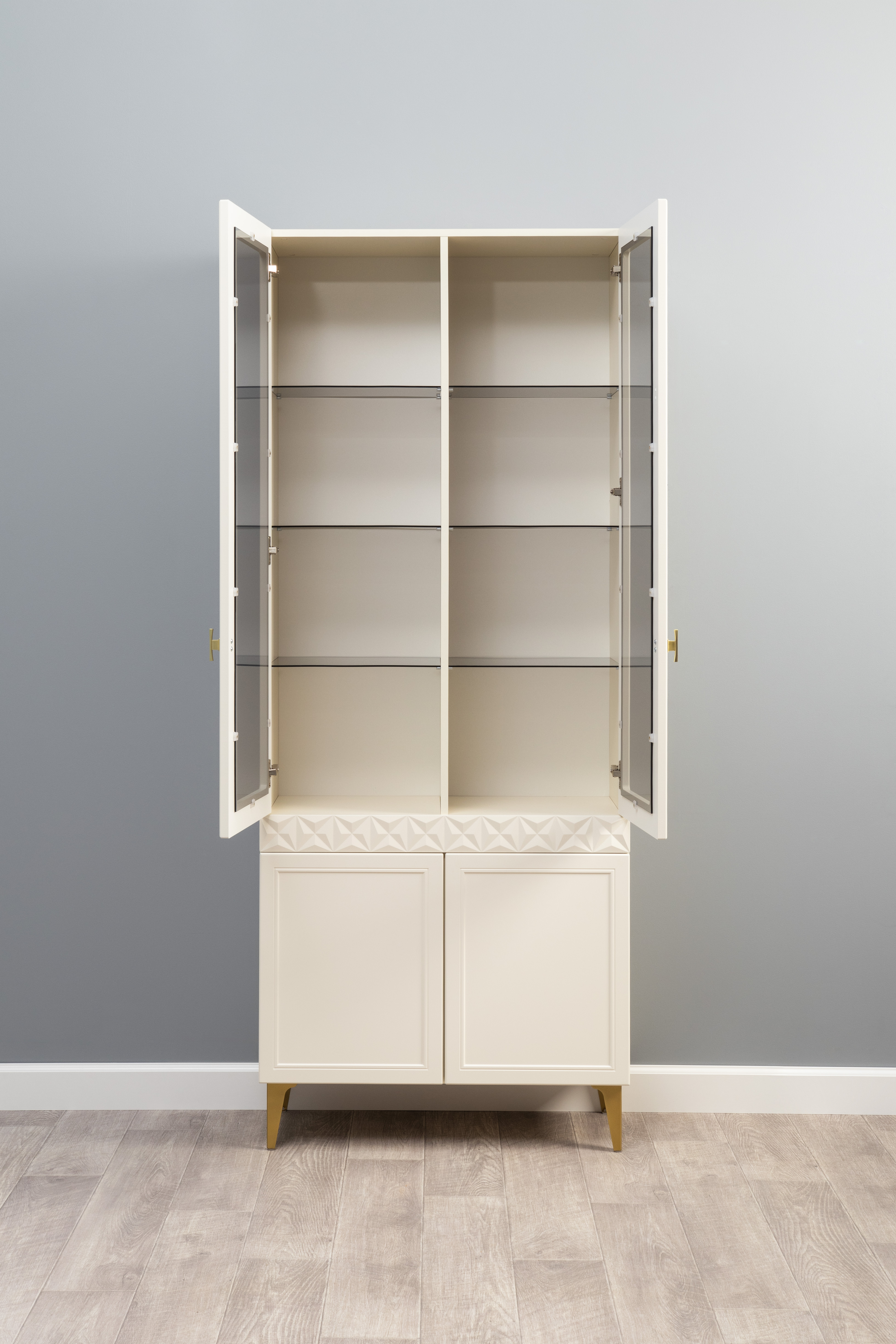 В коллекции представлены три типа витрин с тонированным закалённым стеклом, которые придают пространству лёгкость и свет. «Марион» — идеальное сочетание традиций и актуального дизайна в каждой детали.