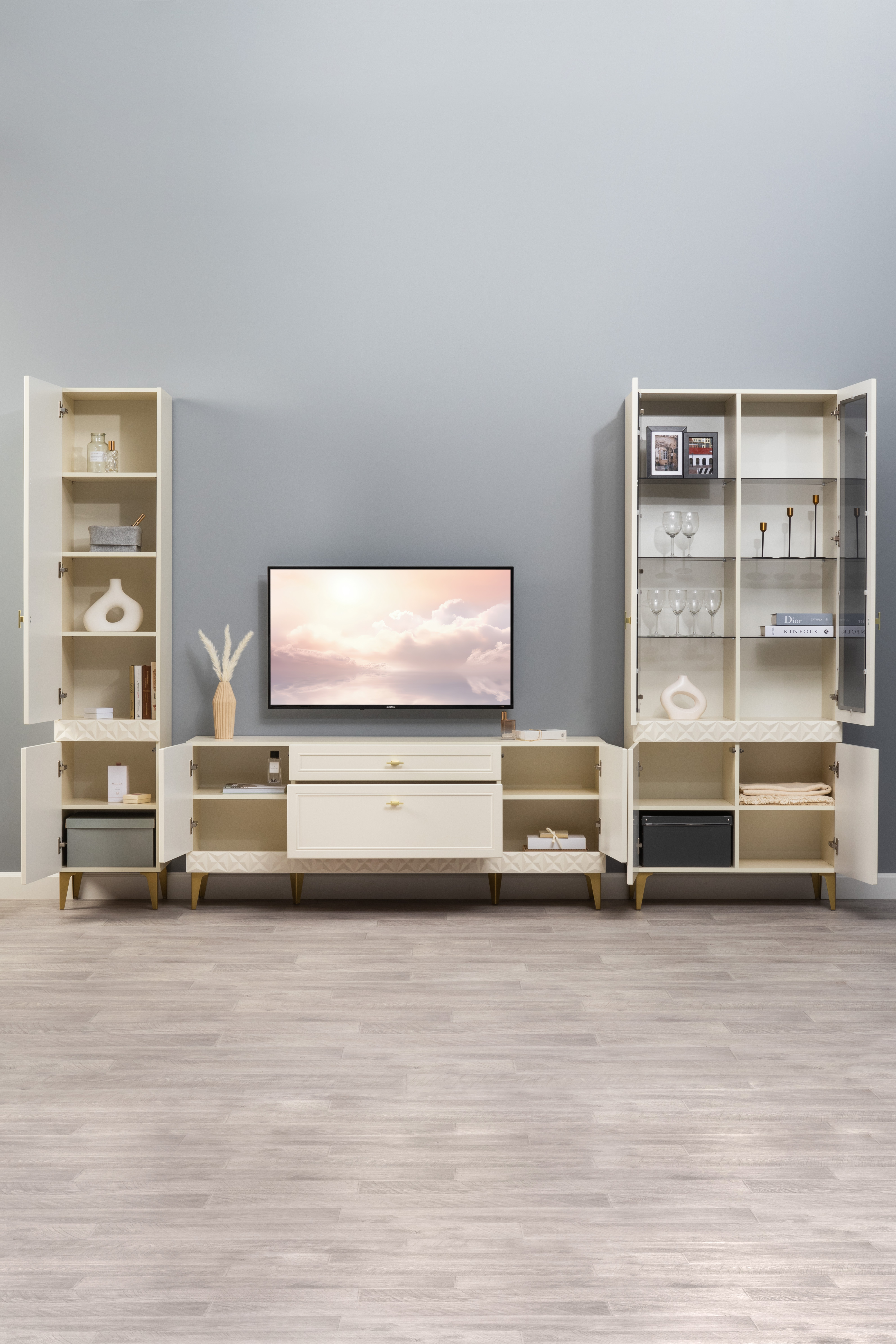 Гостиная Марион композиция 2 слоновая кость С341 PE, слоновая кость 6898 ПВХ, белый PE шагрень (собирается на любую сторону)