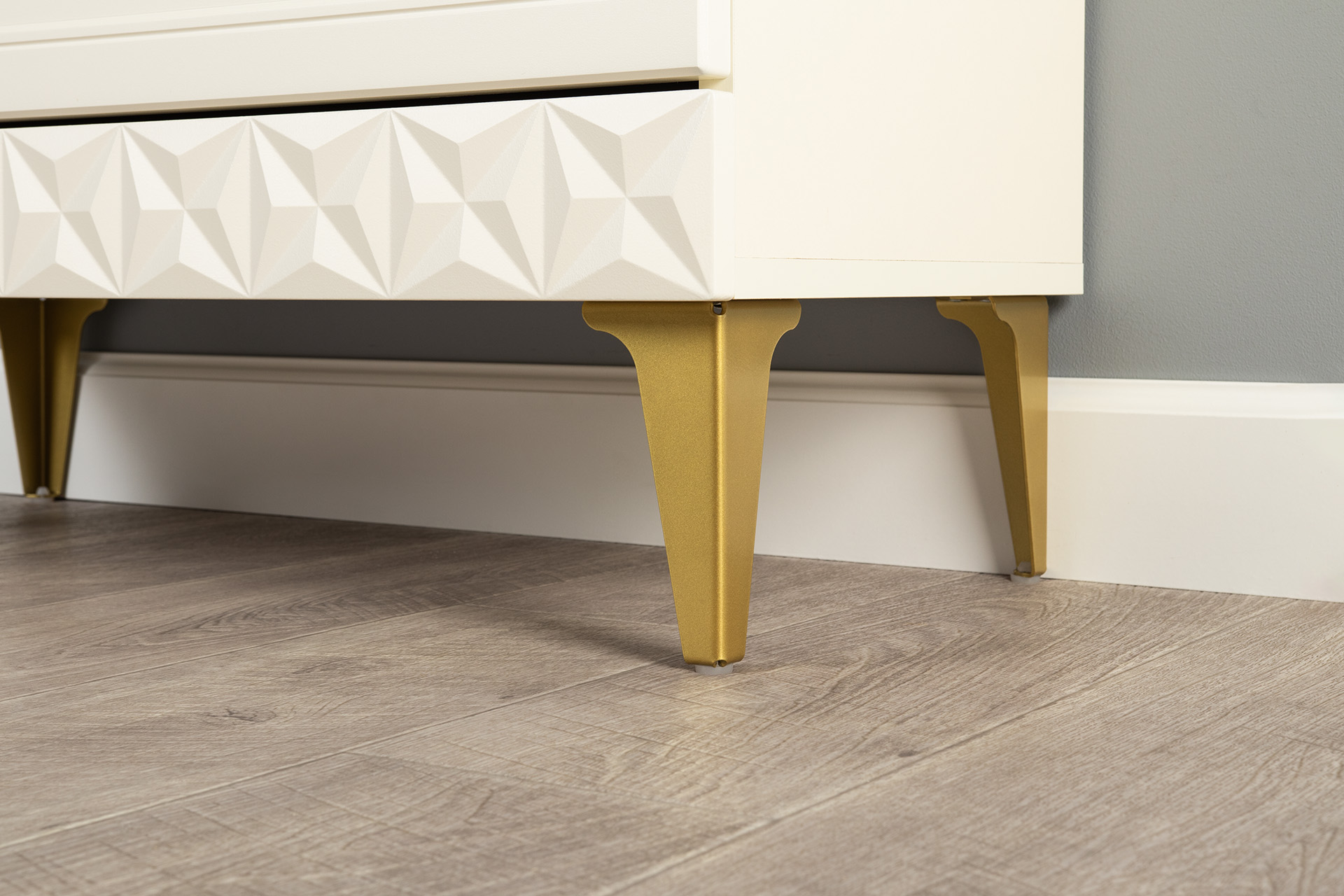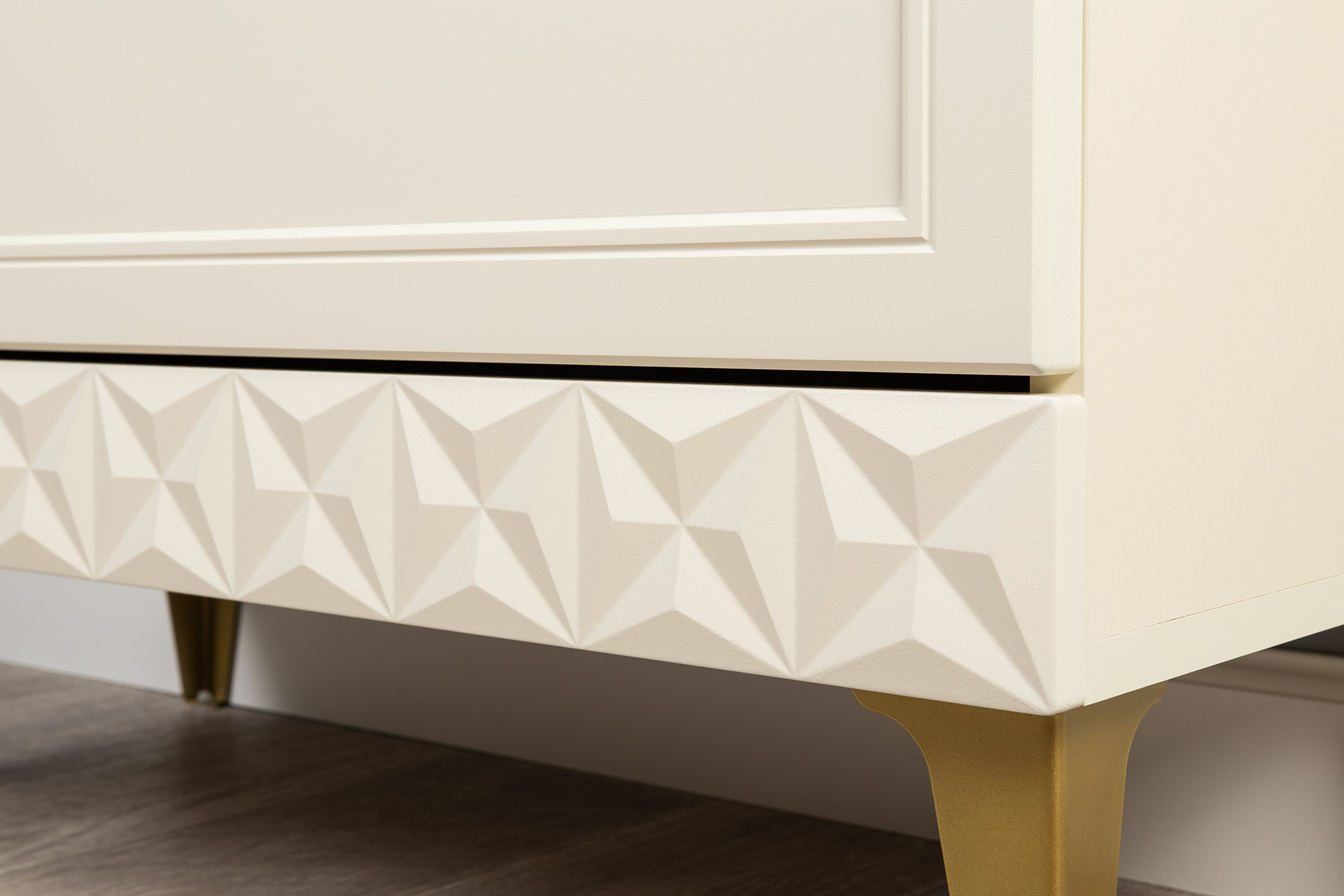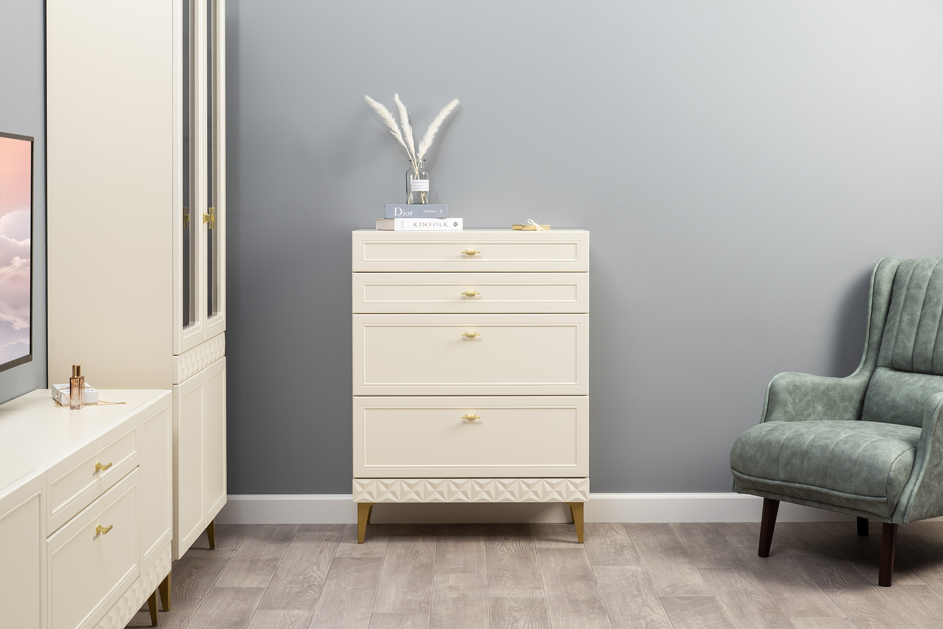 Изящные линии, глубокая фрезеровка фасадов из МДФ и благородные оттенки. Утончённая «Слоновая кость» и изысканная «Олива Шагрень» с глубоким зелёным тоном — создают атмосферу уюта, тепла и благородства. Металлические ручки и опоры золотого цвета придают мебели утончённый блеск, а петли и направляющие с доводчиками обеспечивают плавное и бесшумное закрытие фасадов.
