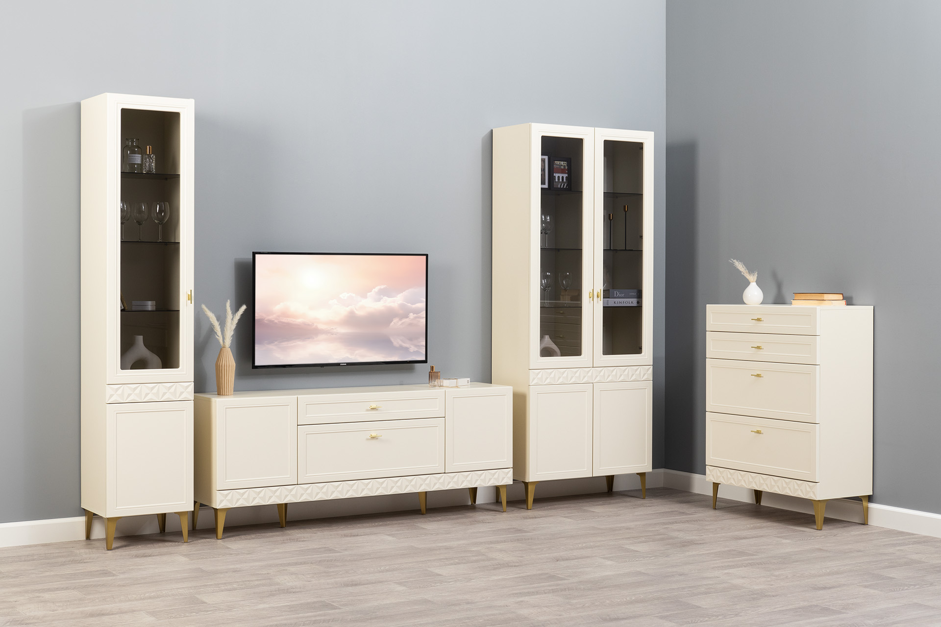 В коллекции представлены три типа витрин с тонированным закалённым стеклом, которые придают пространству лёгкость и свет. «Марион» — идеальное сочетание традиций и актуального дизайна в каждой детали.