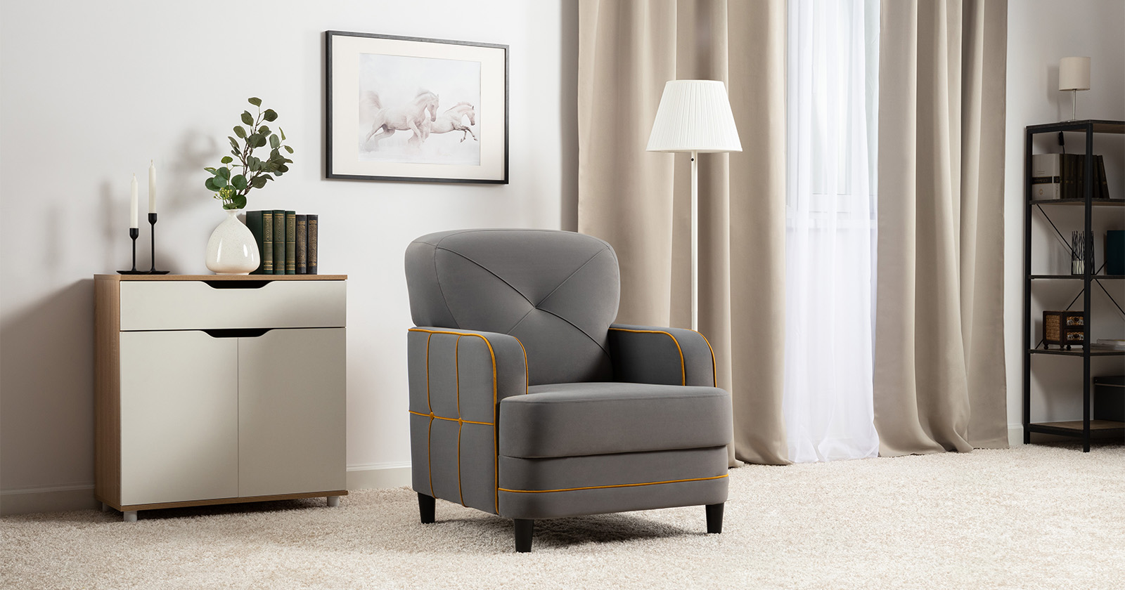 Декоративные канты на вставке подлокотников. Пуговицы в местах пересечения кантов на подушке и вставке подлокотников. По торцам подлокотников и думках контрастный декоративный кант. Защипы на сиденье и подушке.