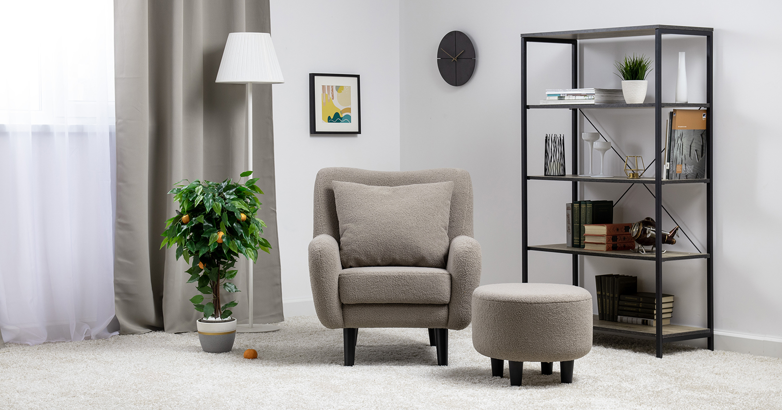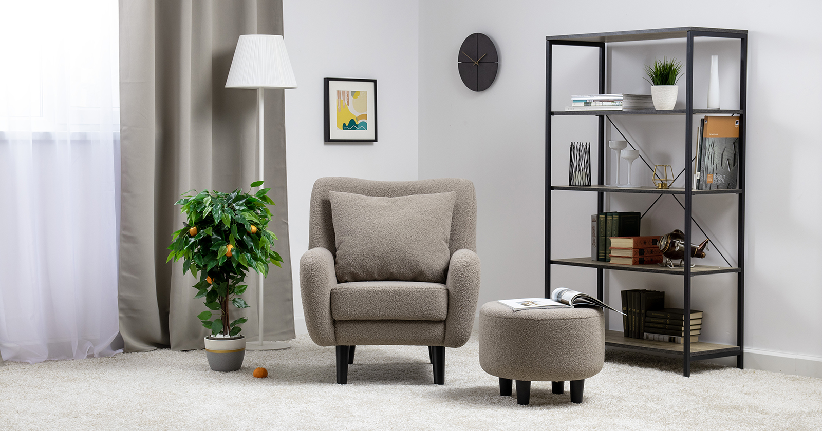 Ткань букле делает кресло особенно уютным и мягким. Приспинная подушка в цвете кресла