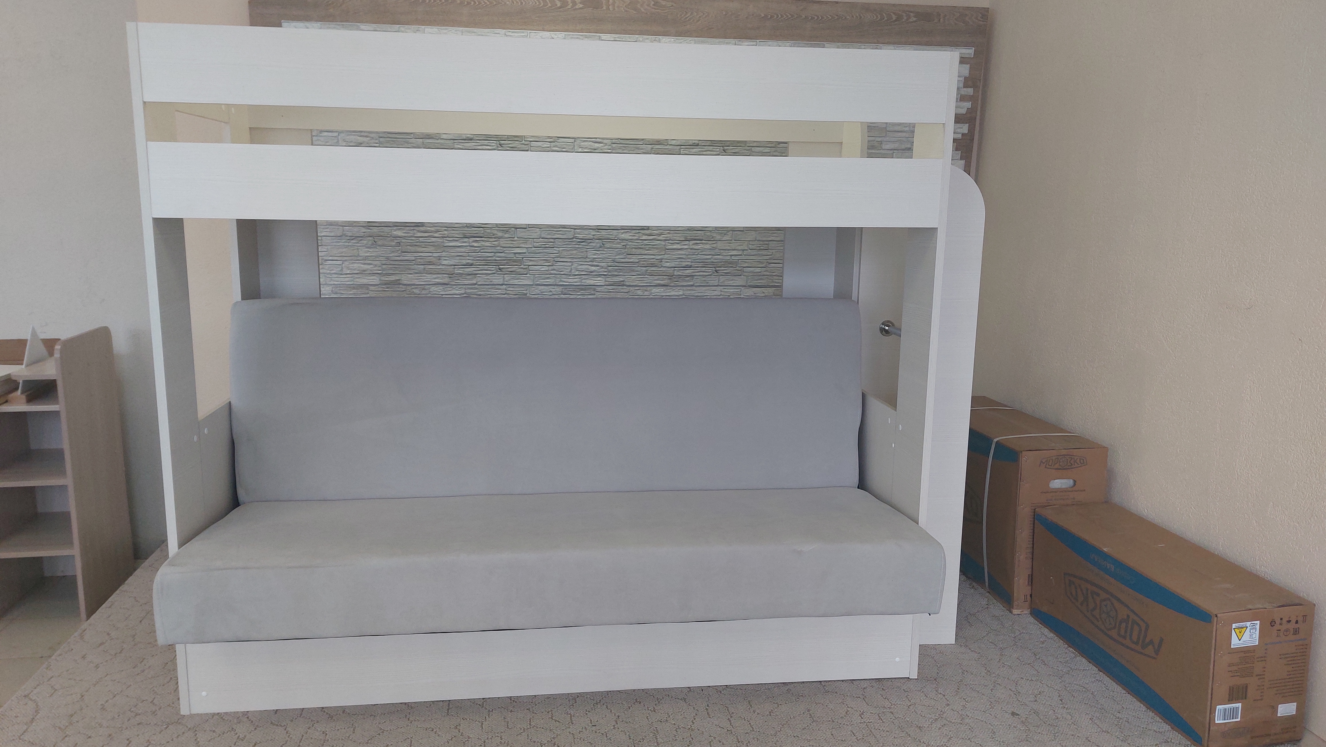 Диван раскладывается, сборка у кровати универсальная: Вы можете установить лестницу как справа, так и слева.