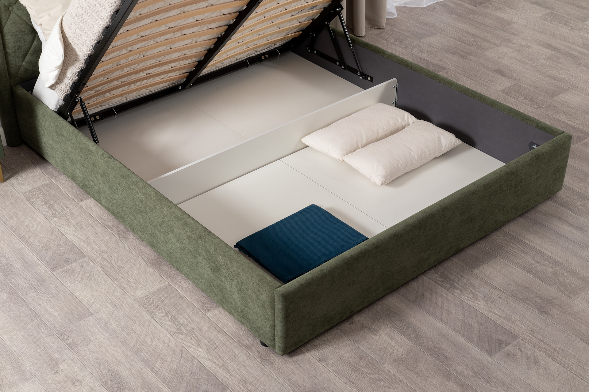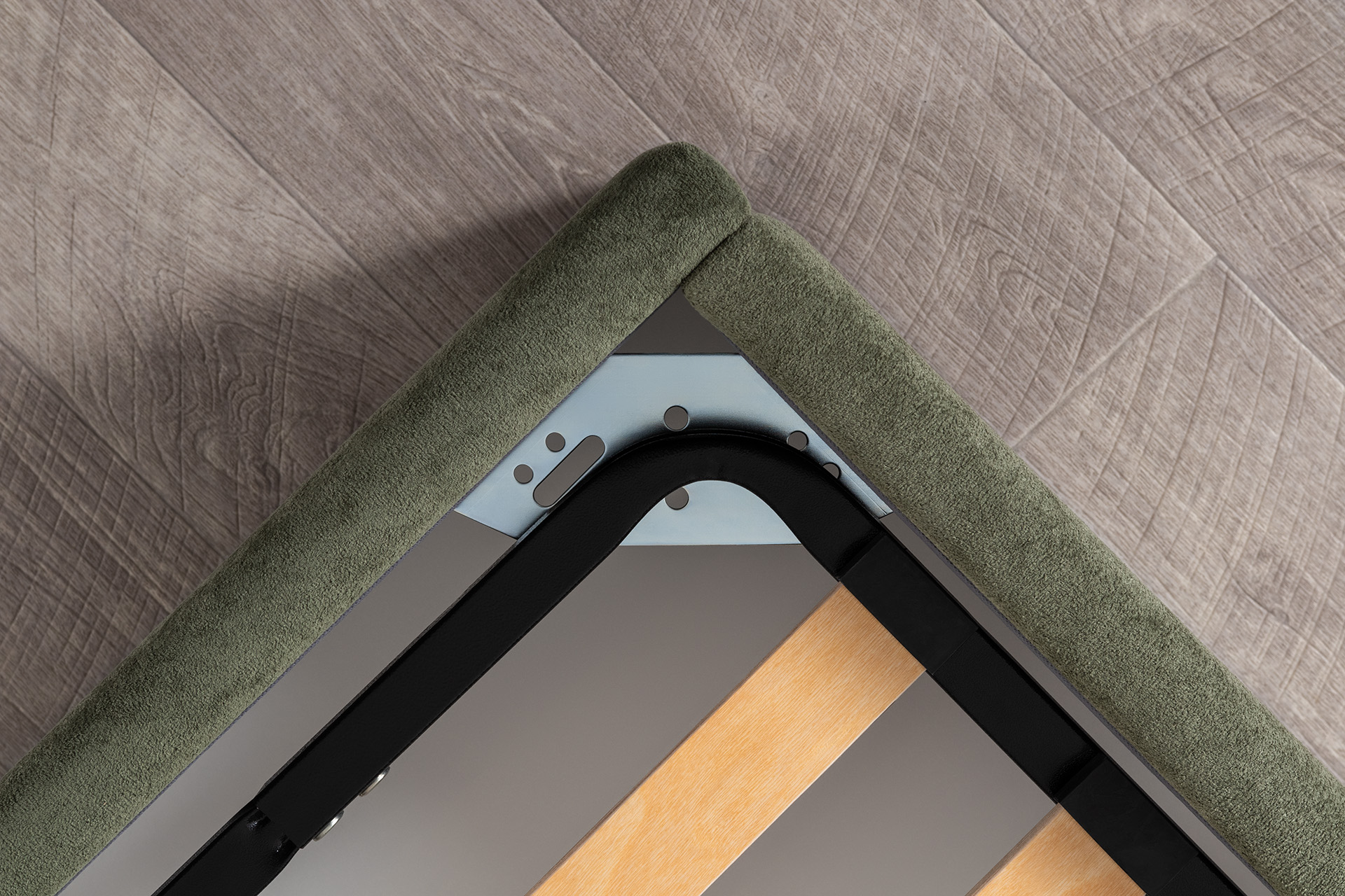 Основание кровати укомплектовано матрасодержателями. Жесткое кроватное дно из ЛДСП 16 мм на опорах 25 мм.