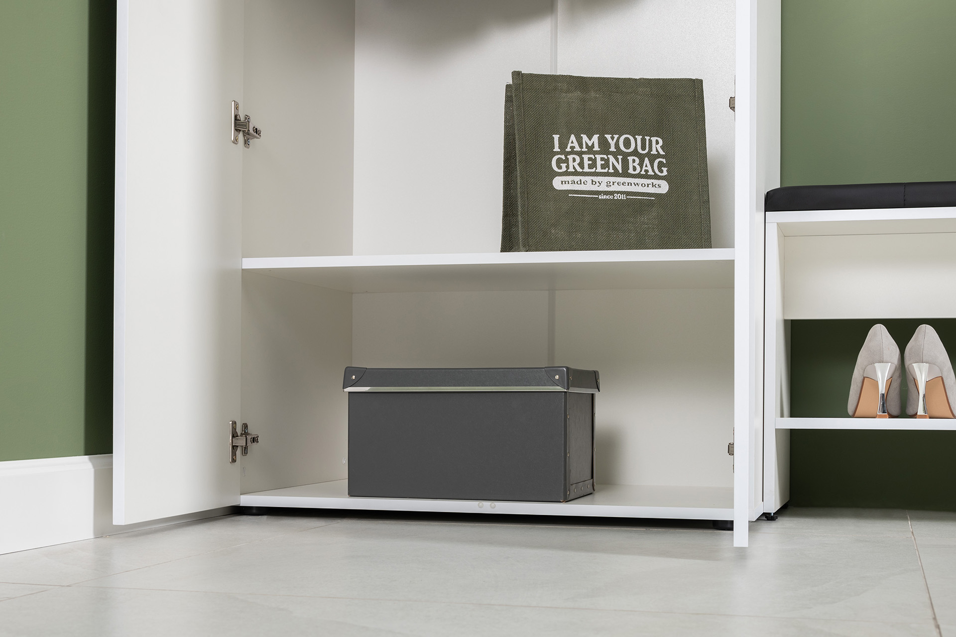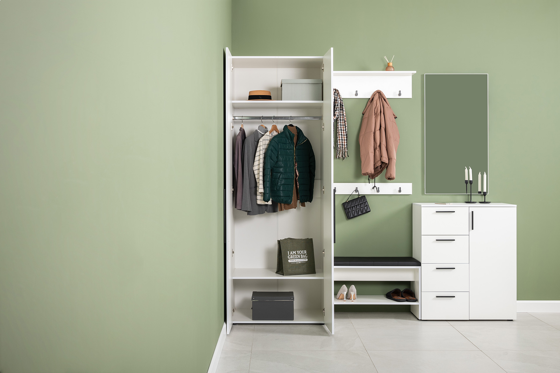 Вместительный шкаф полноразмерной глубины можно дополнить тумбой для обуви с мягким сиденьем и нишами для хранения, зеркалом и минималистичными вешалками.
