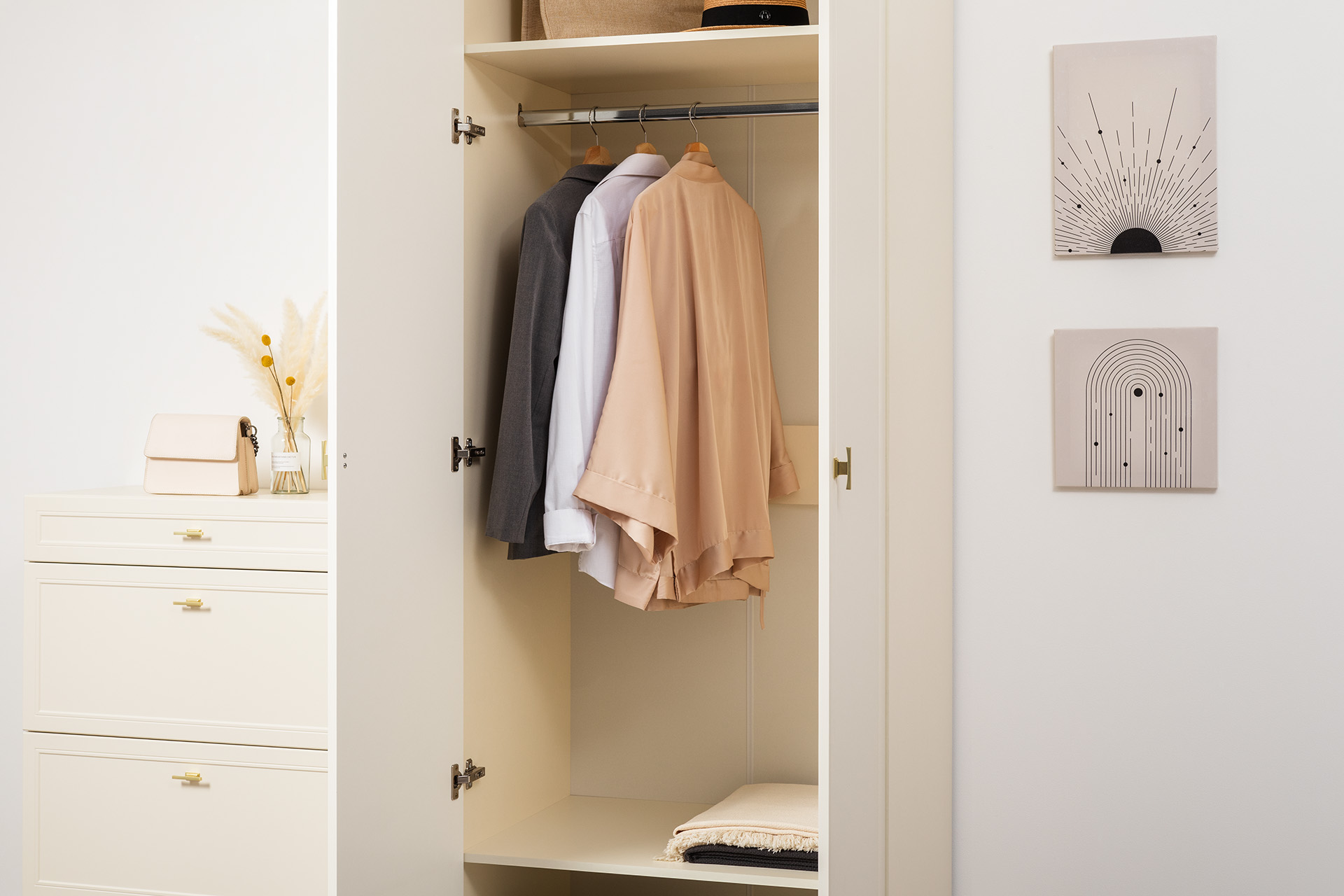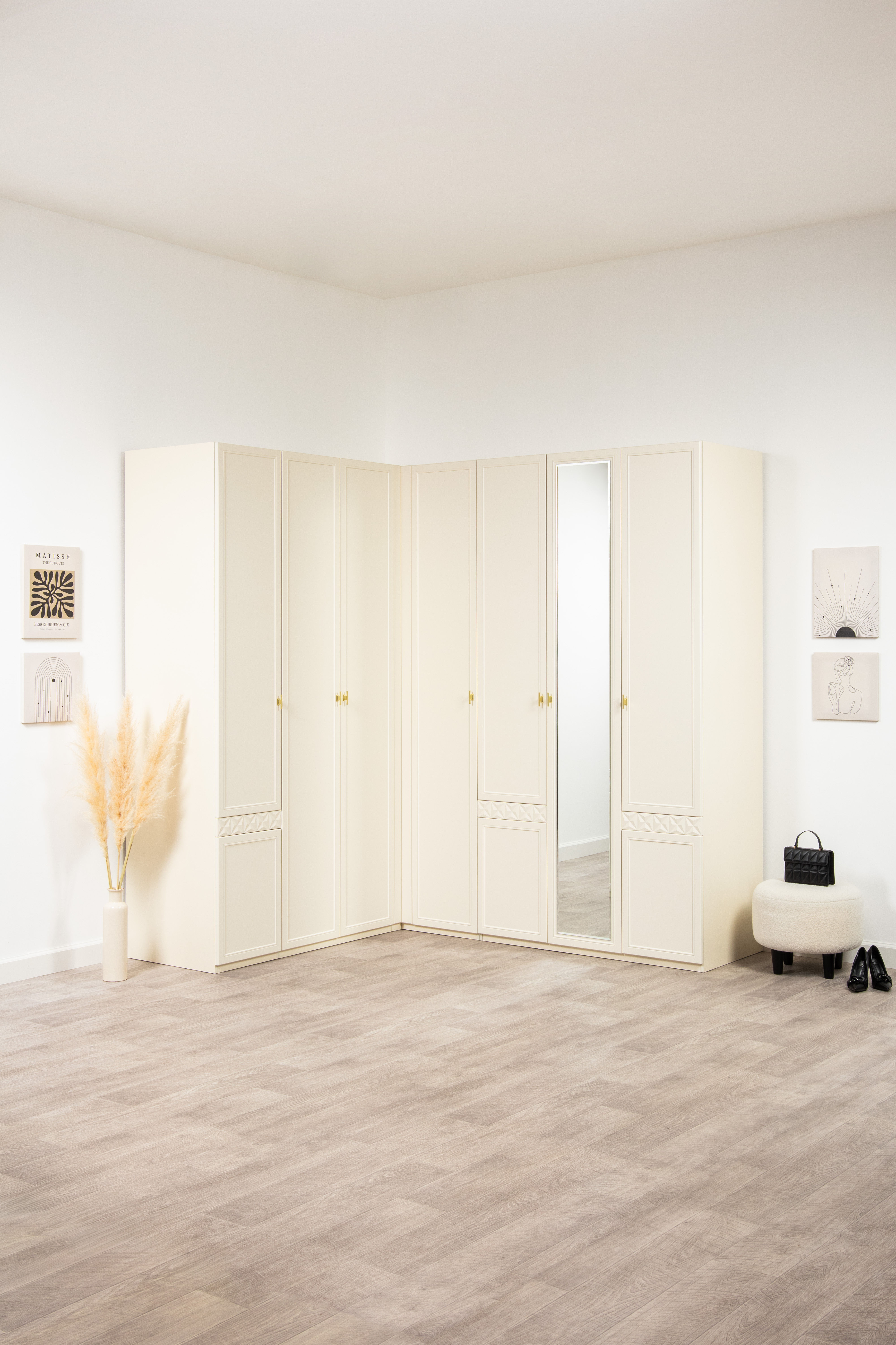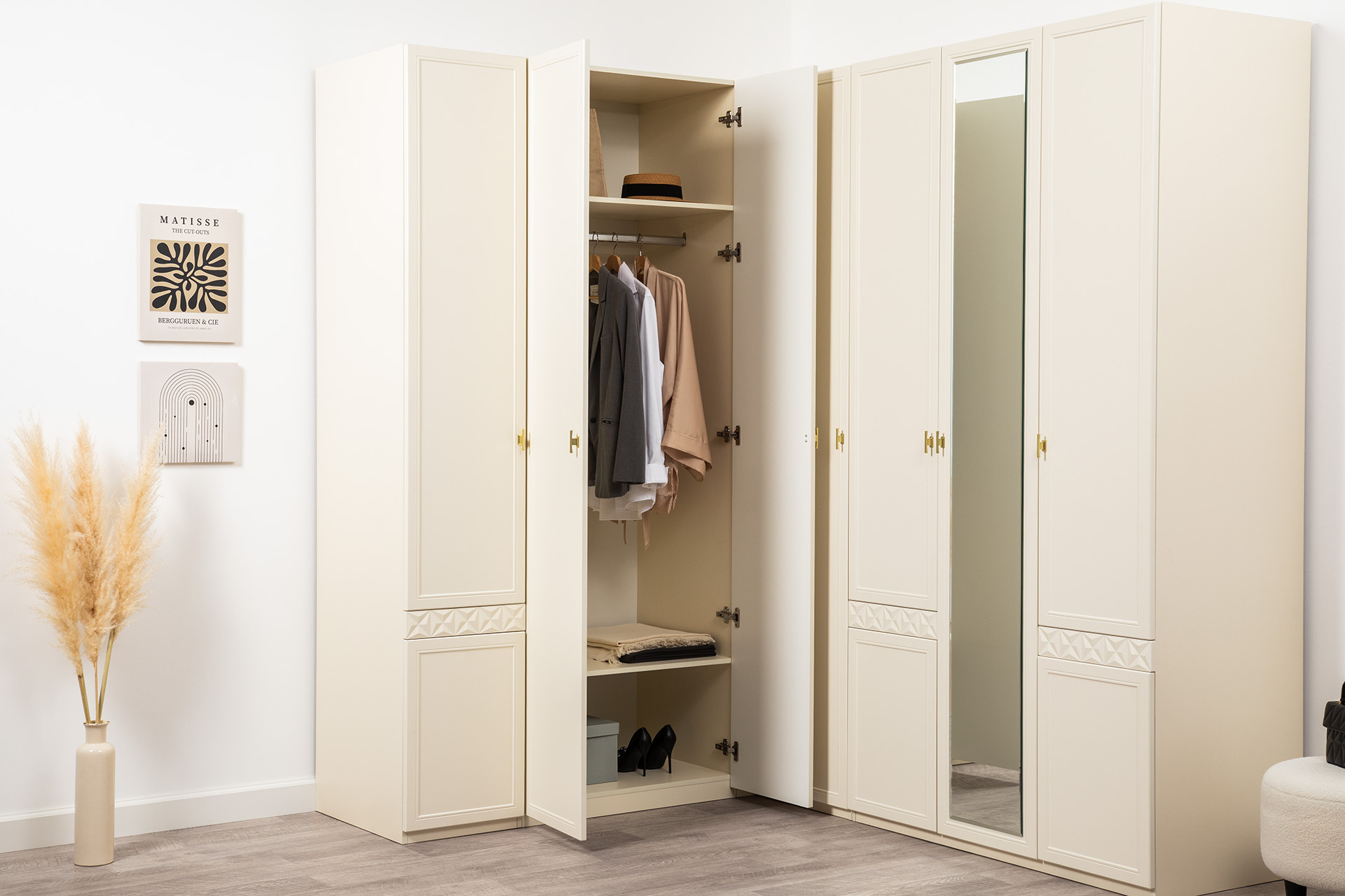 Изящные линии, глубокая фрезеровка фасадов из МДФ и благородные оттенки. Утончённая «Слоновая кость» и изысканная «Олива Шагрень» с глубоким зелёным тоном — создают атмосферу уюта, тепла и благородства. Металлические ручки и опоры золотого цвета придают мебели утончённый блеск, а петли и направляющие с доводчиками обеспечивают плавное и бесшумное закрытие фасадов.