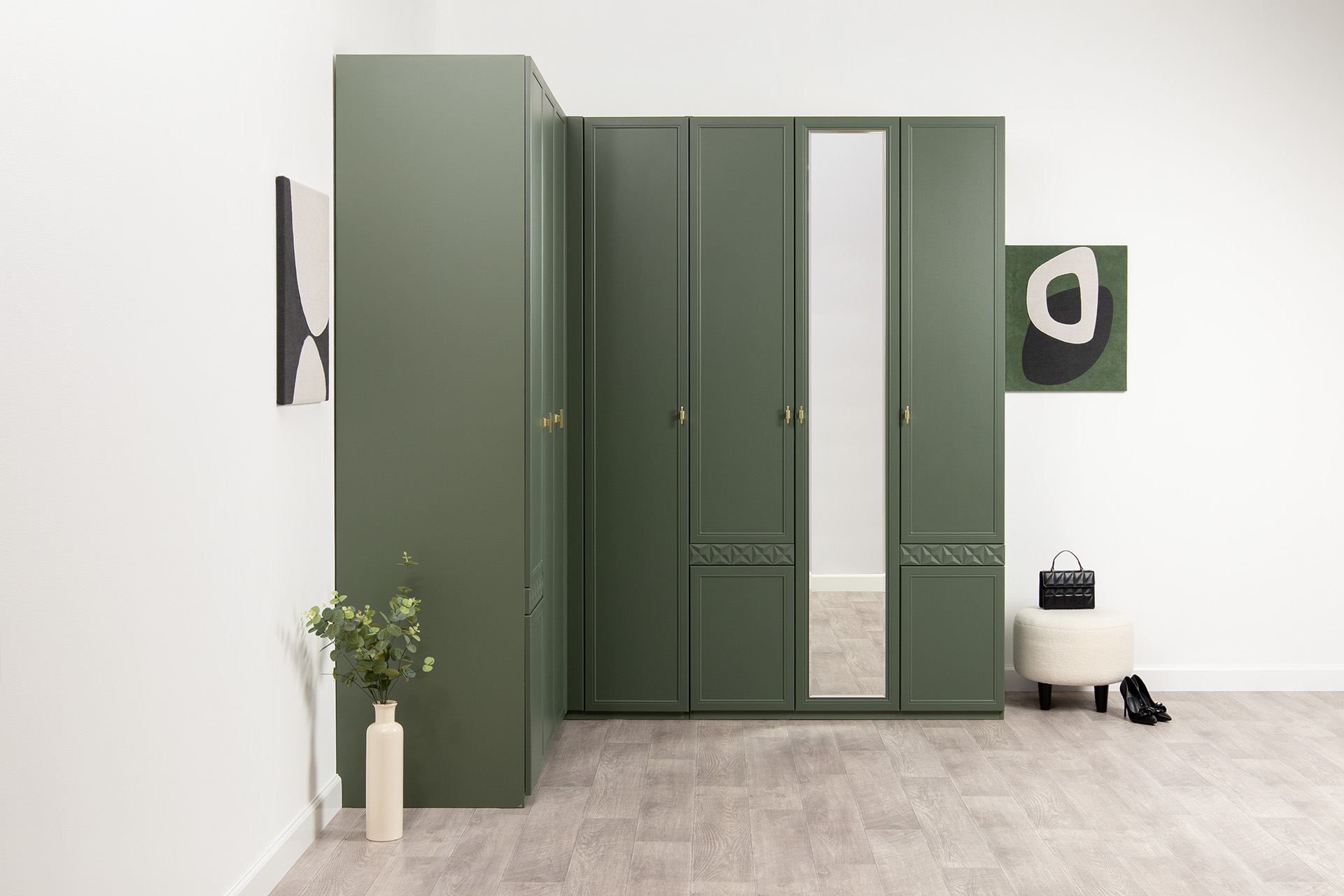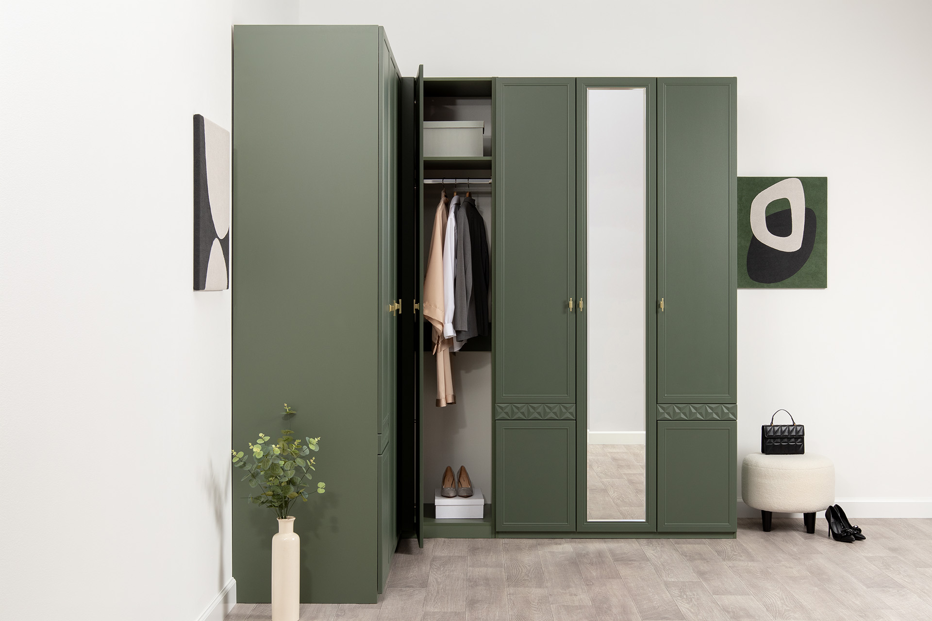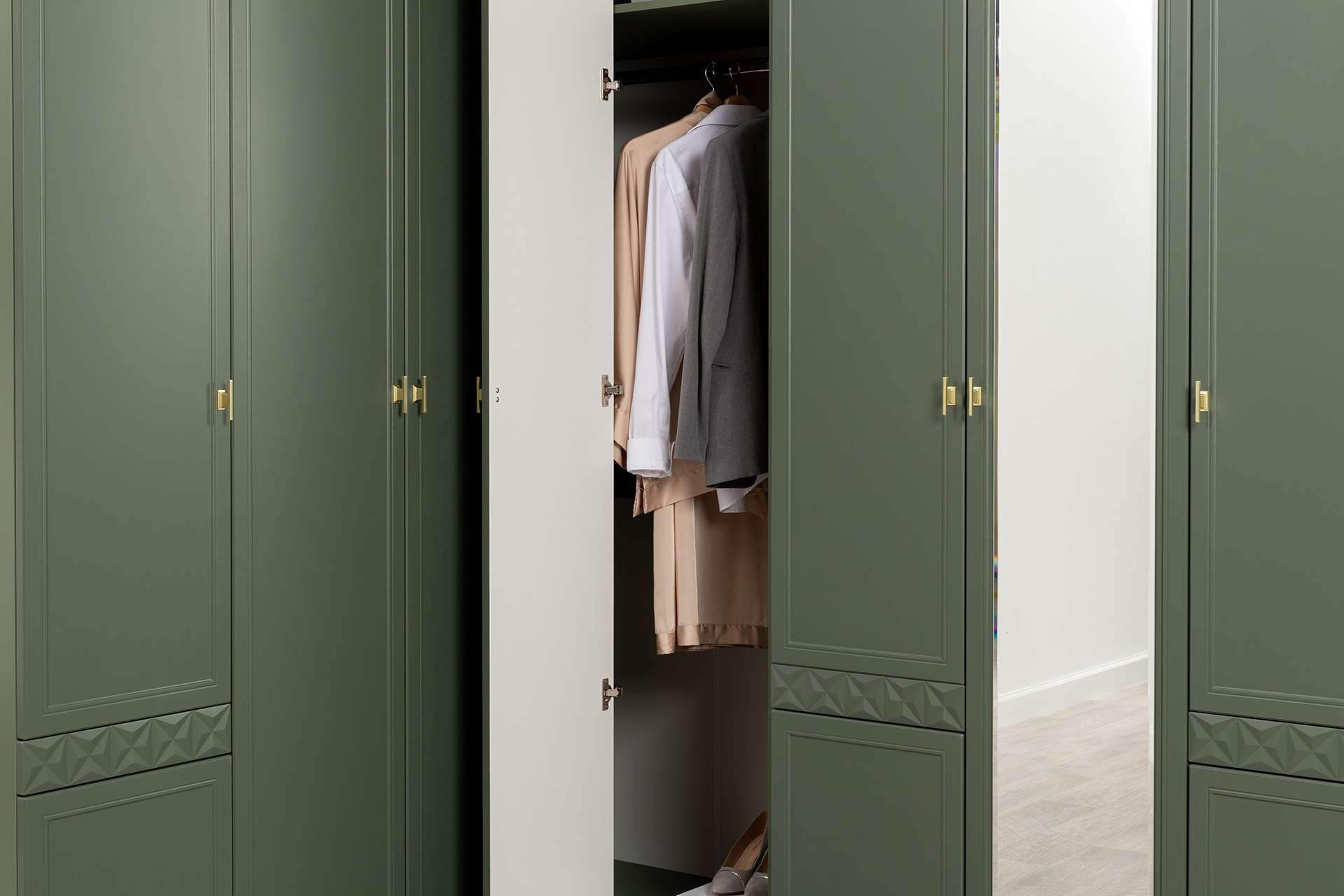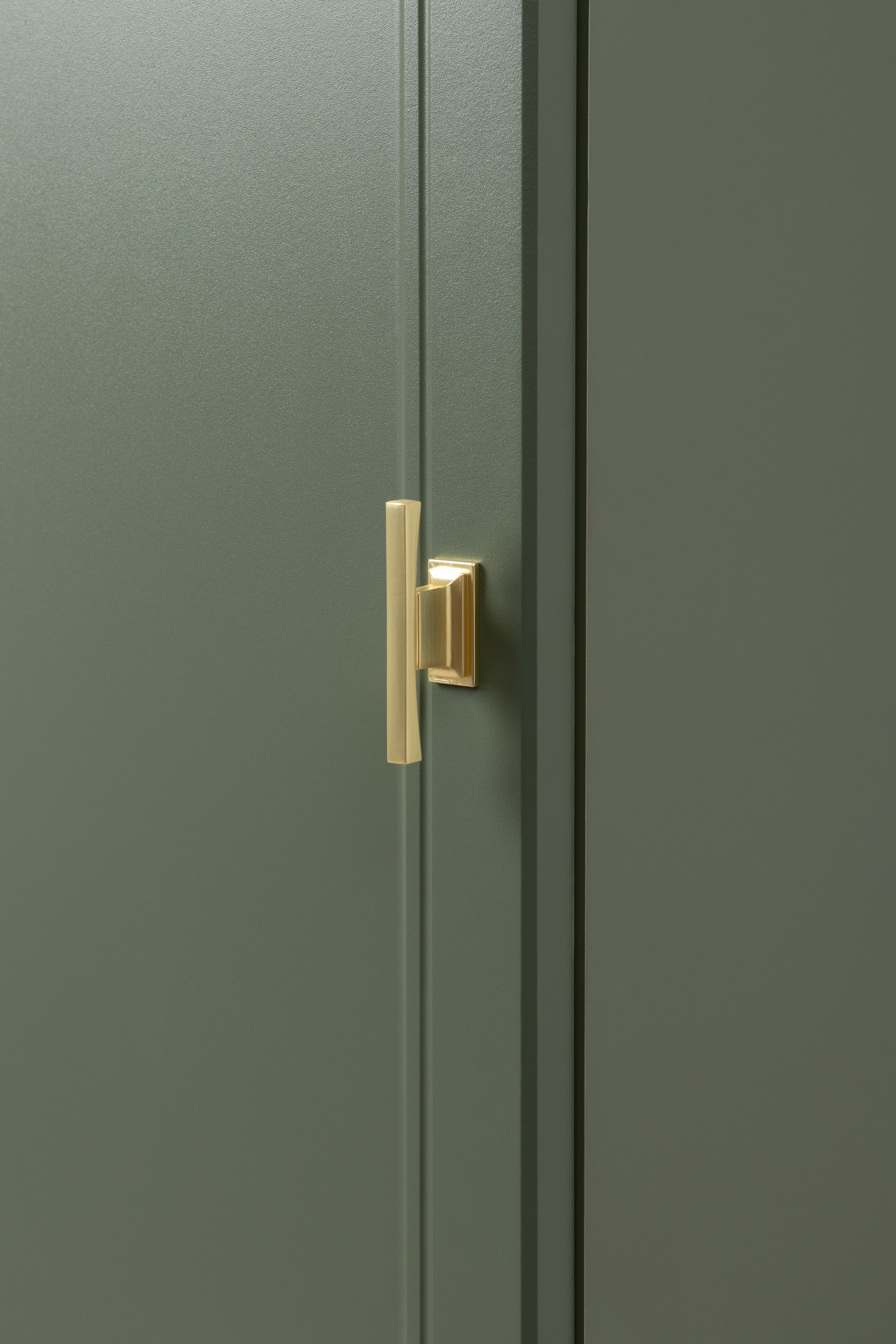 Изящные линии, глубокая фрезеровка фасадов из МДФ и благородные оттенки. Утончённая «Слоновая кость» и изысканная «Олива Шагрень» с глубоким зелёным тоном — создают атмосферу уюта, тепла и благородства. Металлические ручки и опоры золотого цвета придают мебели утончённый блеск, а петли и направляющие с доводчиками обеспечивают плавное и бесшумное закрытие фасадов.
