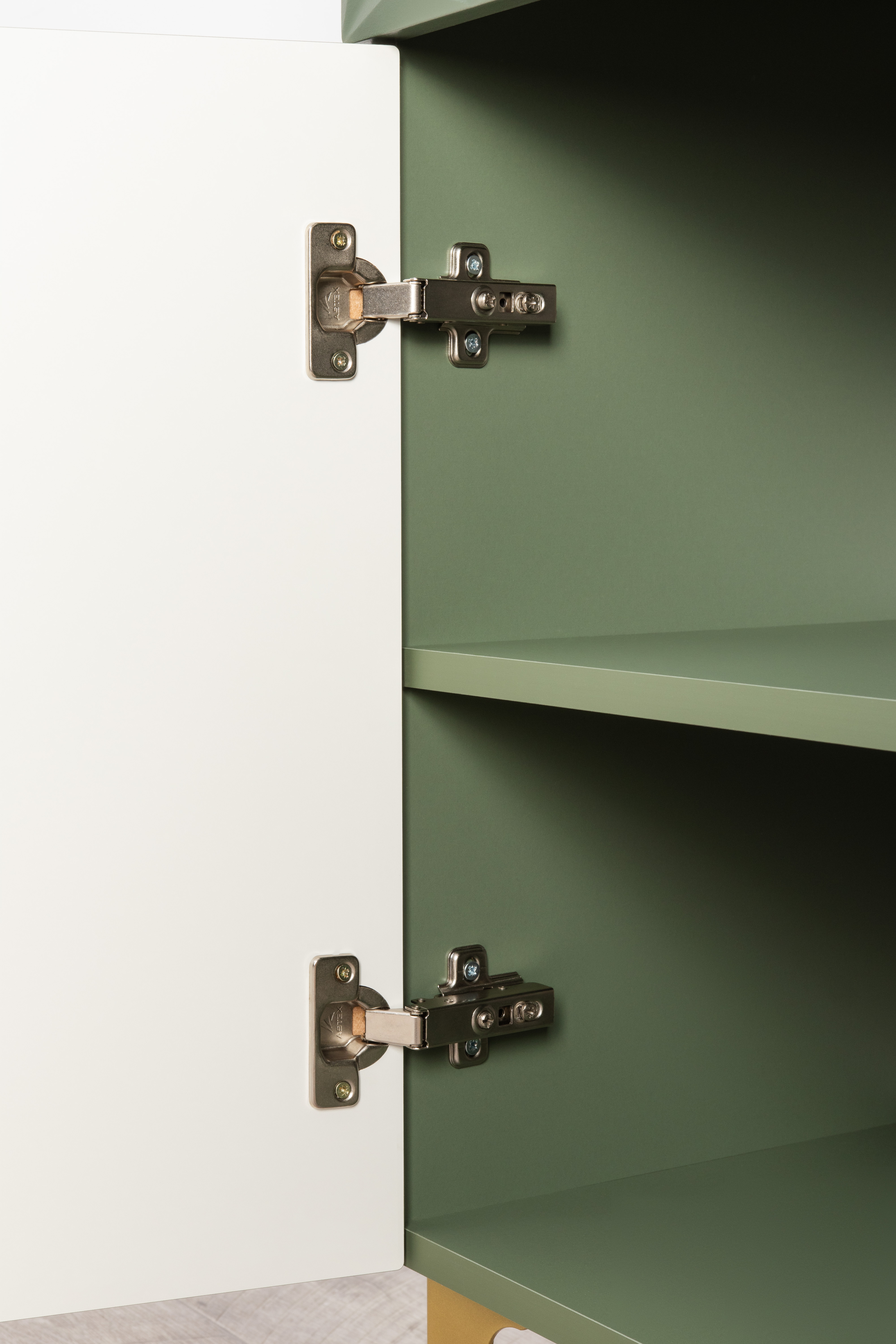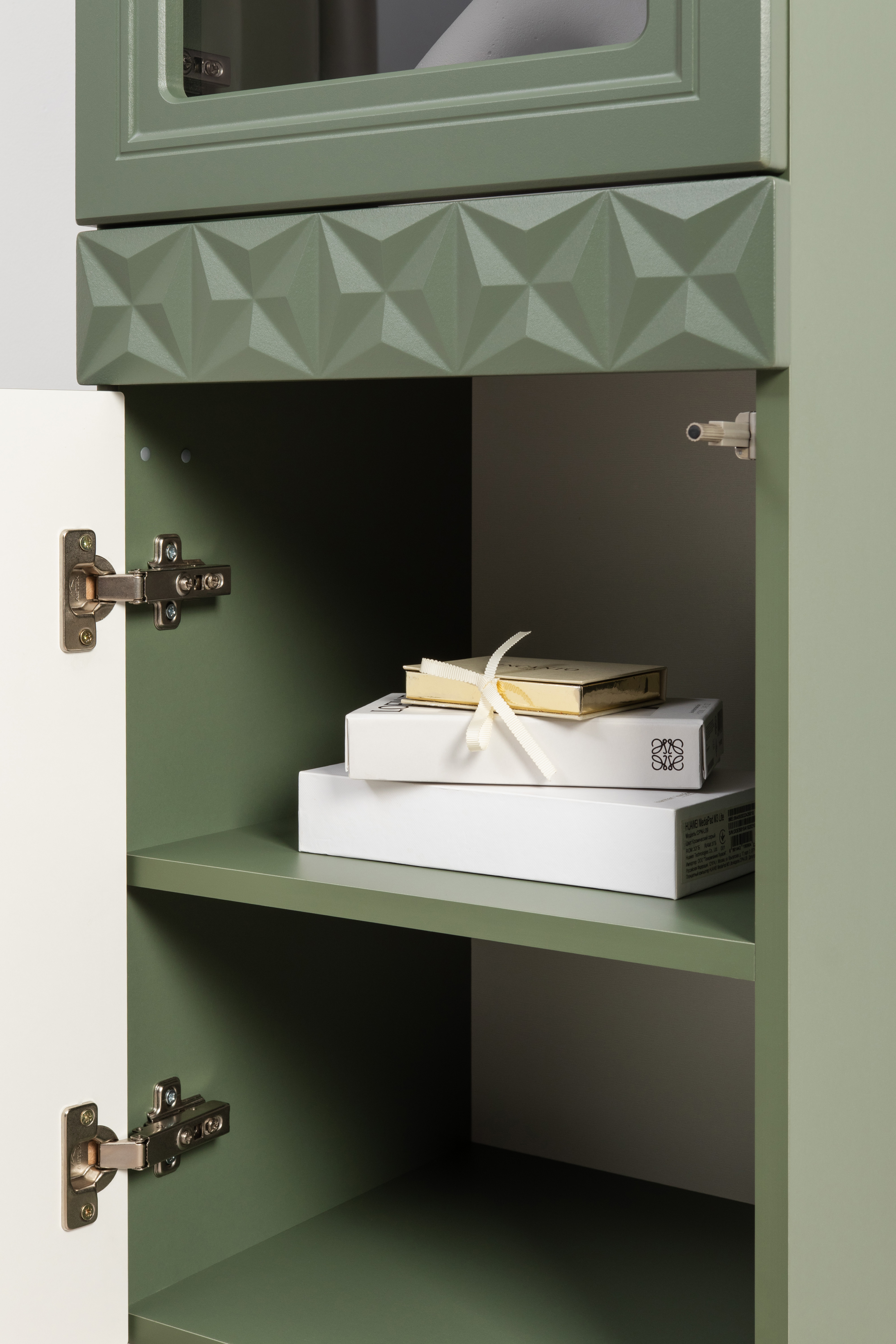 Изящные линии, глубокая фрезеровка фасадов из МДФ и благородные оттенки. Утончённая «Слоновая кость» и изысканная «Олива Шагрень» с глубоким зелёным тоном — создают атмосферу уюта, тепла и благородства. Металлические ручки и опоры золотого цвета придают мебели утончённый блеск, а петли и направляющие с доводчиками обеспечивают плавное и бесшумное закрытие фасадов.