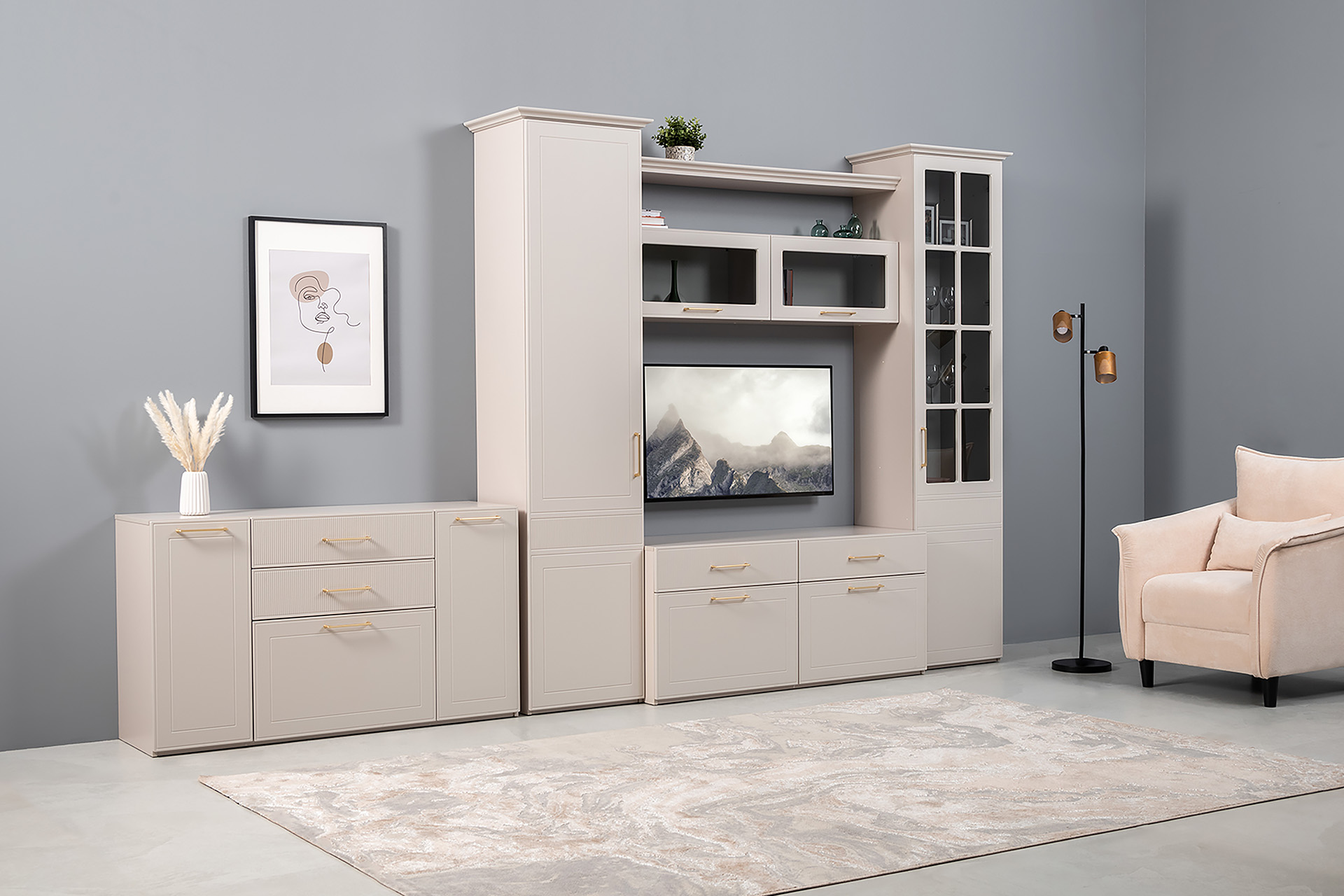 Тумба под ТВ Ричфорд 16.61 кашемир 5981 BS, моно керамика D166-2 ПВХ, белый PE шагрень