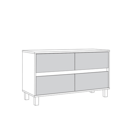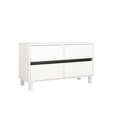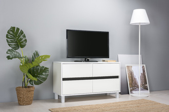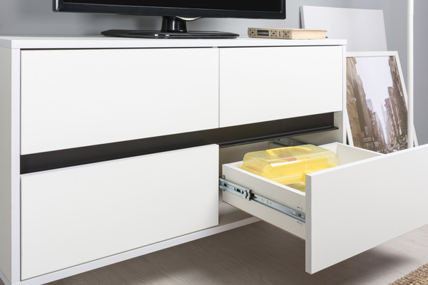 Продуманный функционал, лаконичный дизайн и минималистичность форм являются основными свойствами этой тумбы и позволяют ей отлично вписываться в любой интерьер.Корпус тумбы выполнен из белой плиты, выдвижные ящики графично разделены горизонтальной черной полосой из алюминиевого профиля. В столешнице имеется вырез под провода для удобства подключения мультимедиа техники, а регулируемые опоры легко компенсируют неровности пола.